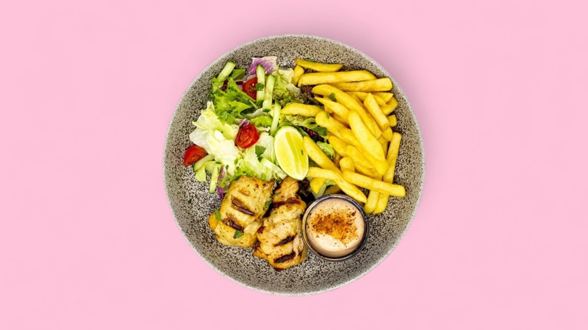 Hähnchenoberkeule mit Piri-Piri-Marinade, Cayenne-Dip, knackigem Salat und Pommes frites