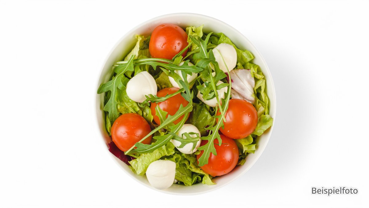 mit grüner Salat aus Paprika, Gurken, Tomaten und Mozzarella