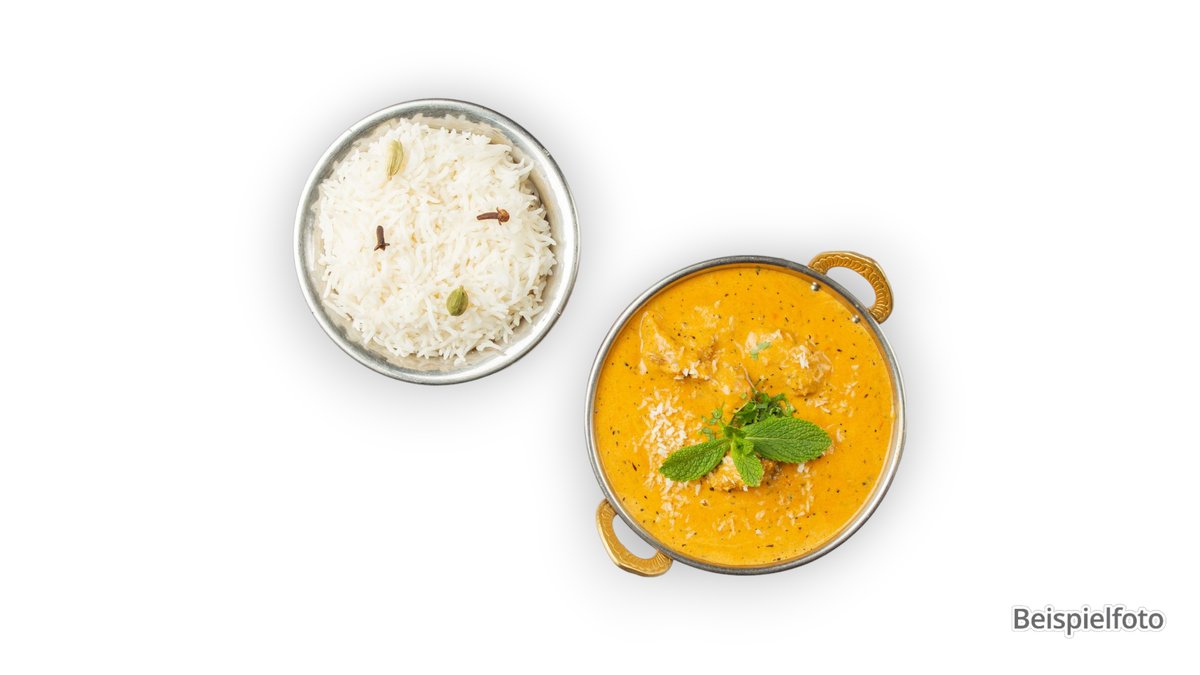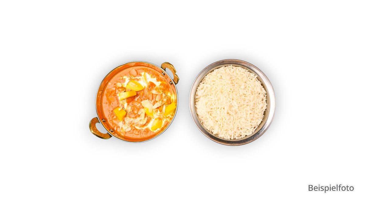 alle Gerichte werden mit gebratenem Reis zubereitet und Raita serviert