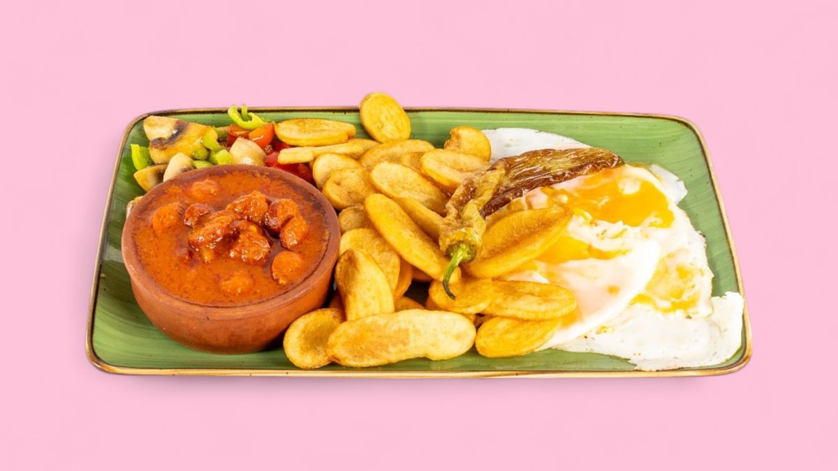 Bratkartoffeln mit gebratenen Paprika und Champignons, Rinderwurst mit Tomatensoße, 3 Rührei und 2 Brötchen Aufgrund der Art und Weise der Aufbewahrung kann das Produkt mit verschiedenen Nüssen in Kontakt kommen