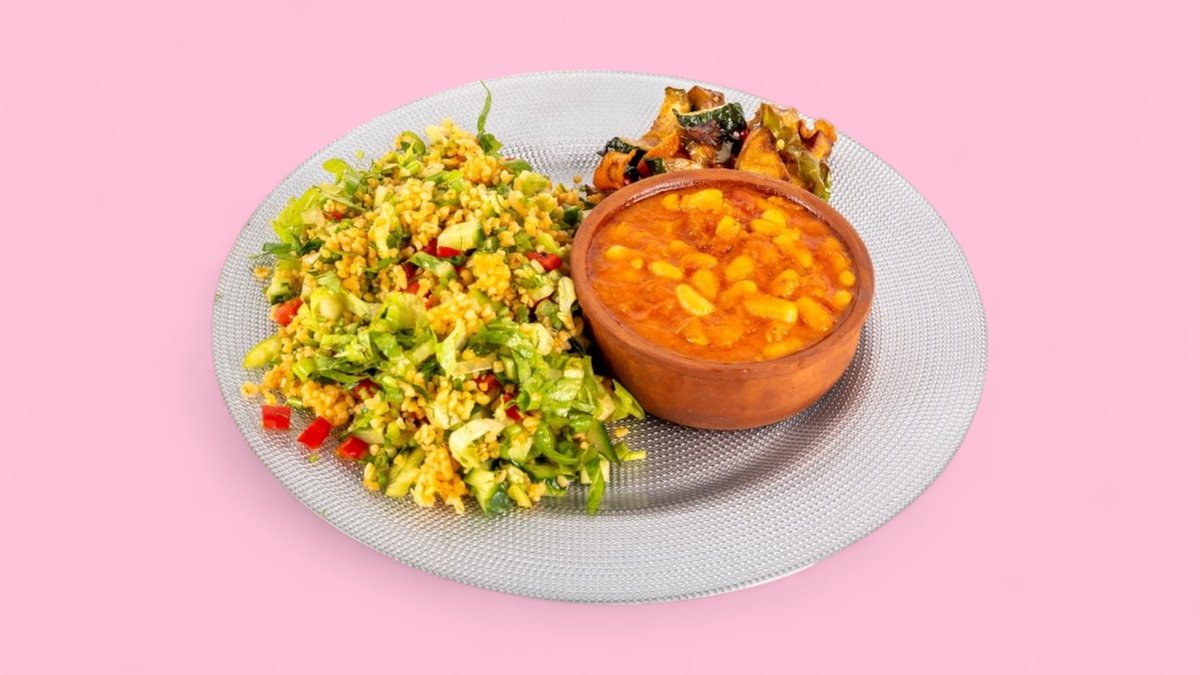 mit gebackenen Bohnen, Bulgursalat und Gemüse Aufgrund der Art und Weise der Aufbewahrung kann das Produkt mit verschiedenen Nüssen in Kontakt kommen