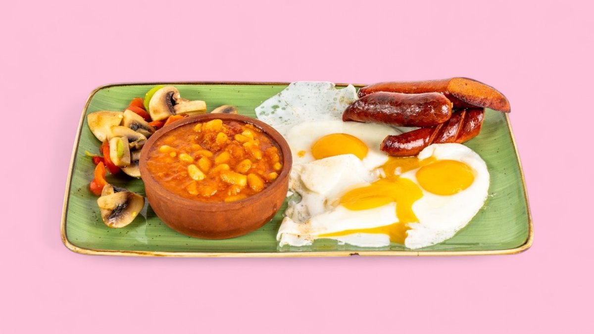 mit gebratener Rinderwurst, Champignons mit Tomatensoße, gebackenen Bohnen, 2 Spiegeleiern und 2 Brötchen Aufgrund der Art und Weise der Aufbewahrung kann das Produkt mit verschiedenen Nüssen in Kontakt kommen