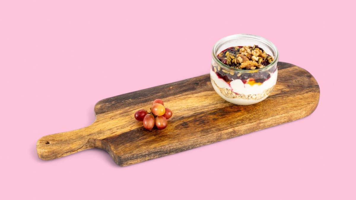 mit Obst, Joghurt und Haferflocken mit Kürbiskernen Aufgrund der Art und Weise der Aufbewahrung kann das Produkt mit verschiedenen Nüssen in Kontakt kommen