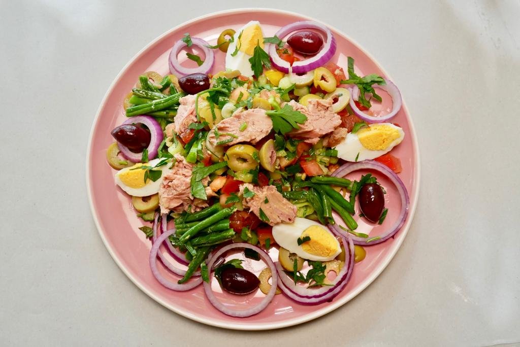 Salat der Saison mit Thunfisch, Paprika, Tomaten, Gurken, roten Zwiebeln, Mais und Eiern