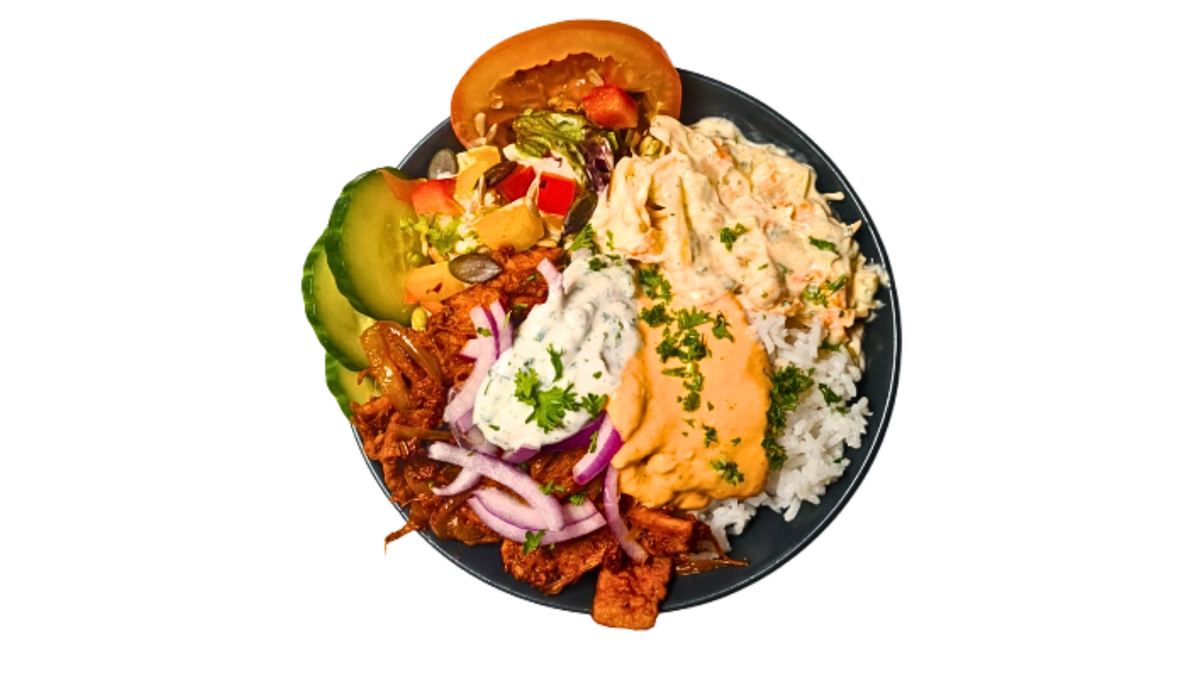 mit Gyros aus Erbsenprotein, Reis, Coleslaw, roten Zwiebeln, gemischtem Salat, Kräuterdip und Herbstidip