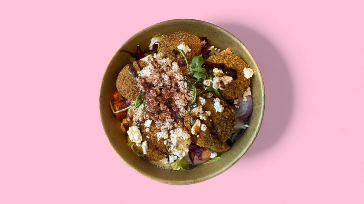 mit Rotkraut, Tomaten, Gurken, roten Zwiebeln, Mais, schwarzen Oliven, Weichkäse, Falafel, Salatsoße und Granatapfelsirup