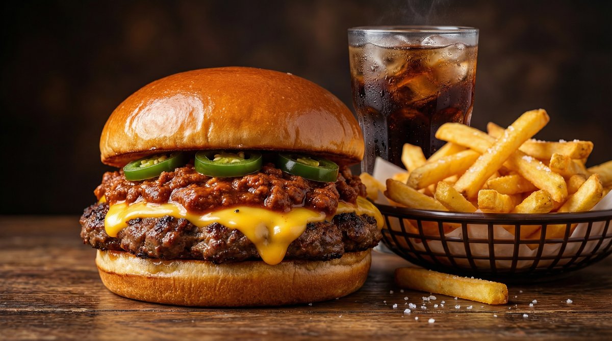 Chili Cheeseburger Menü mit 0,33 l Getränk deiner Wahl