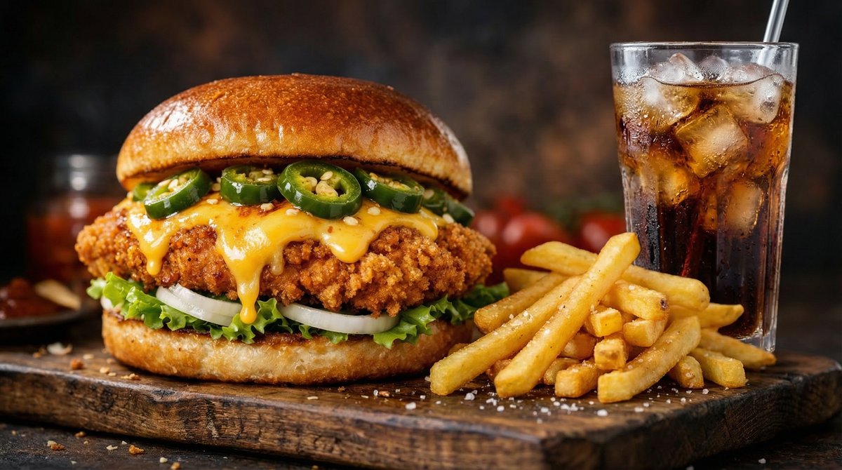 Crispy Chicken Burger Chili Cheese Menü mit 0,33 l Getränk deiner Wahl