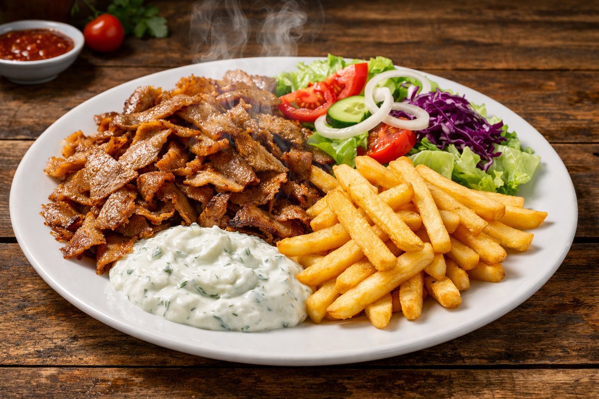mit Pommes frites, Salat, Iskendersoße und Bratpaprika