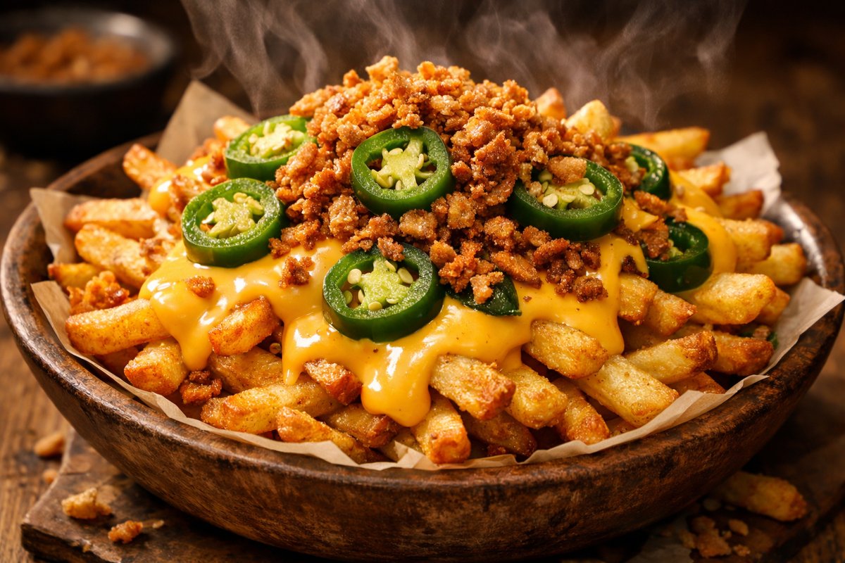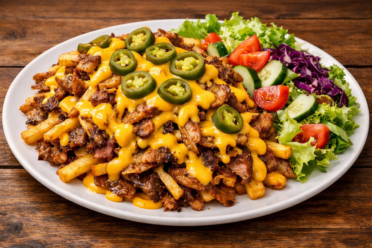 mit Pommes frites, Salat, Käsesoße und Jalapeños