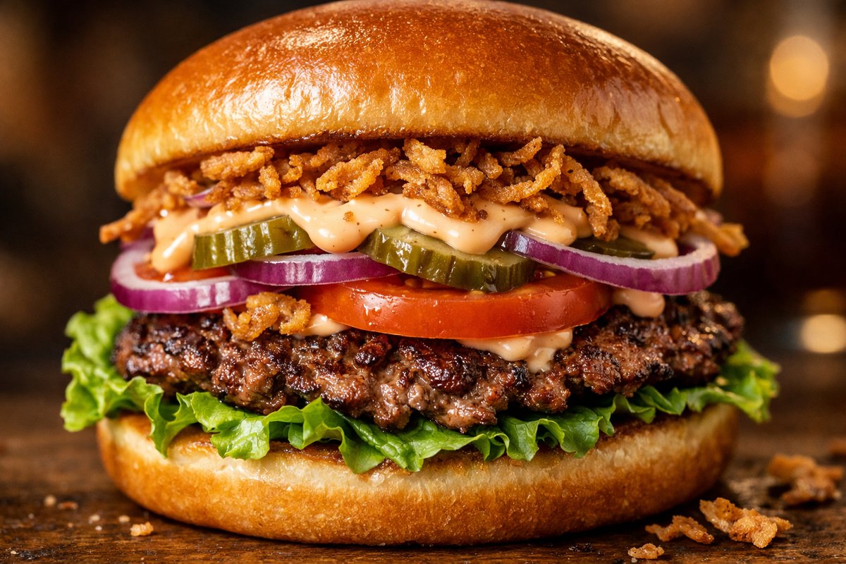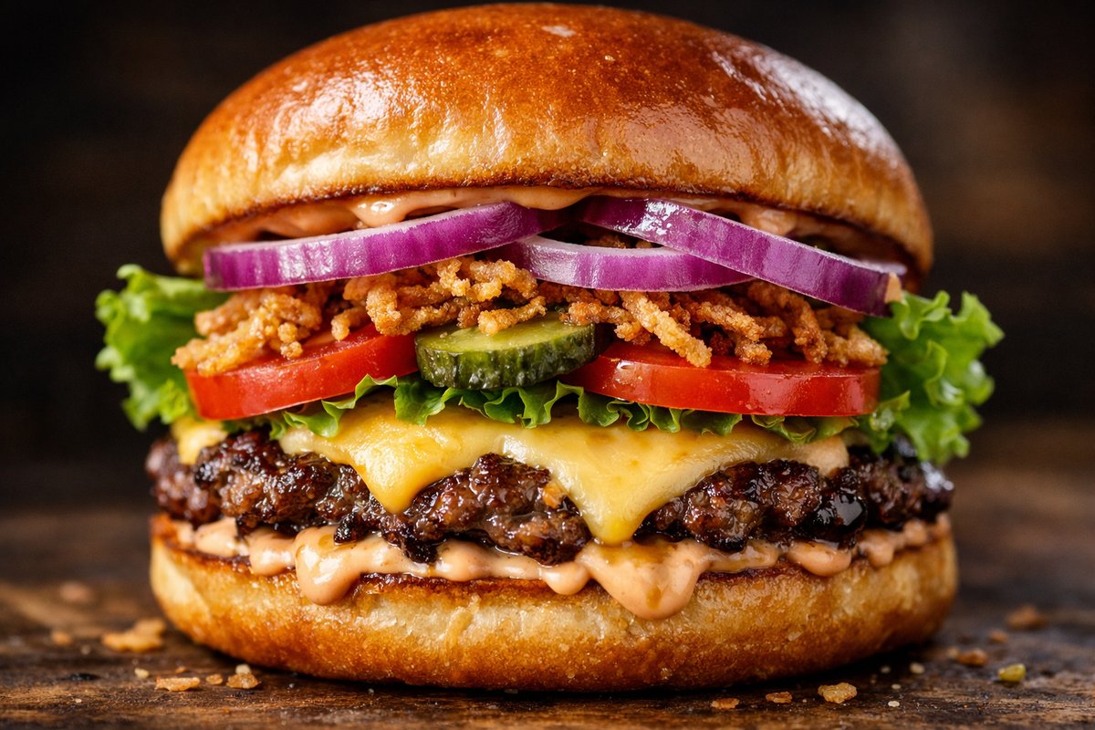mit 180 g Rindfleisch, Cheddar, eingelegten Gurken, Röstzwiebeln, Salat, roten Zwiebeln und Barbecuesoße