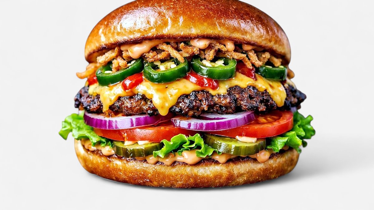 mit 180 g Rindfleisch, Jalapeños, Chili-Käsesoße, Salat, roten Zwiebeln und hausgemachter Burgersoße