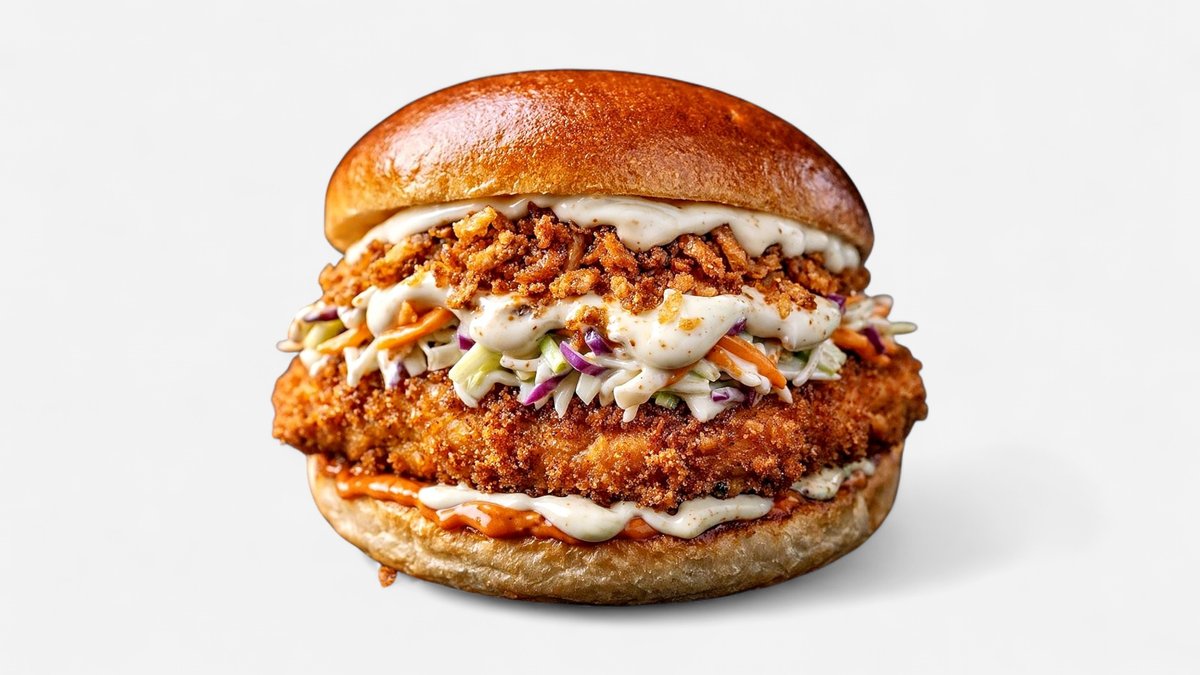 mit Hähnchen im Knuspermantel, Krautsalat, hausgemachter Burgersoße und Aioli