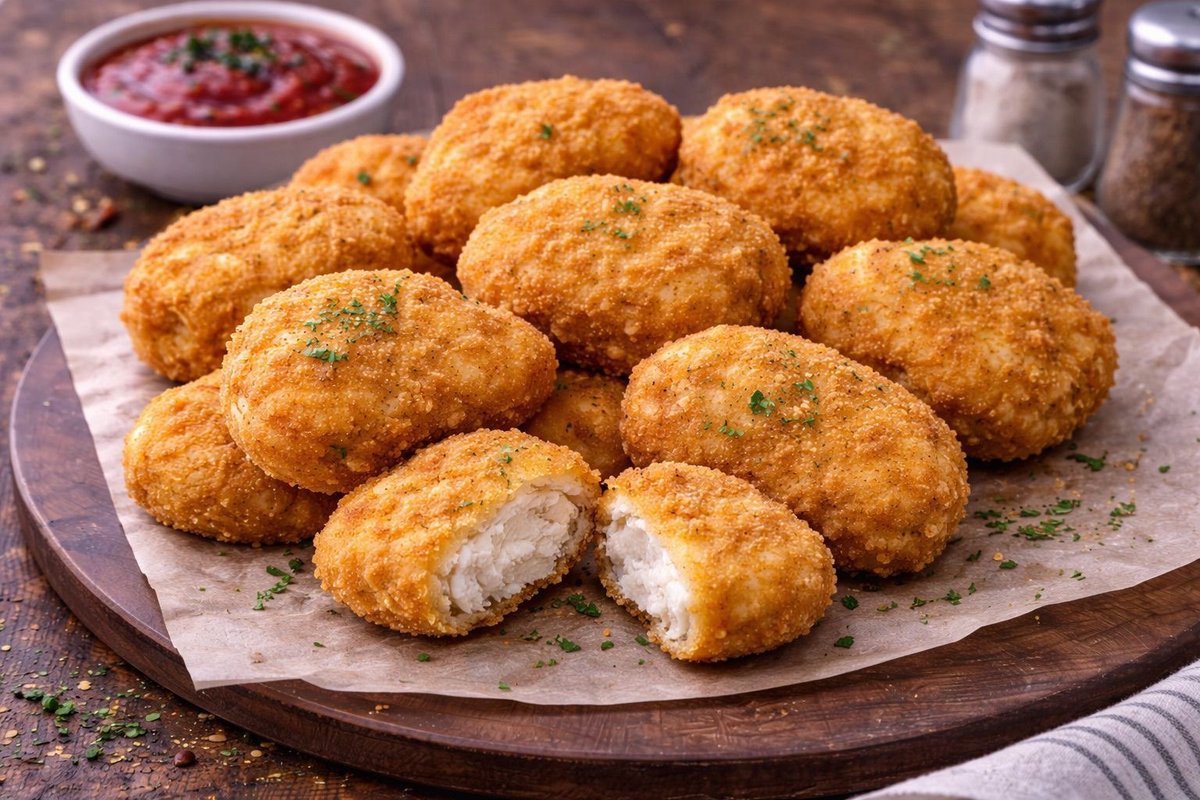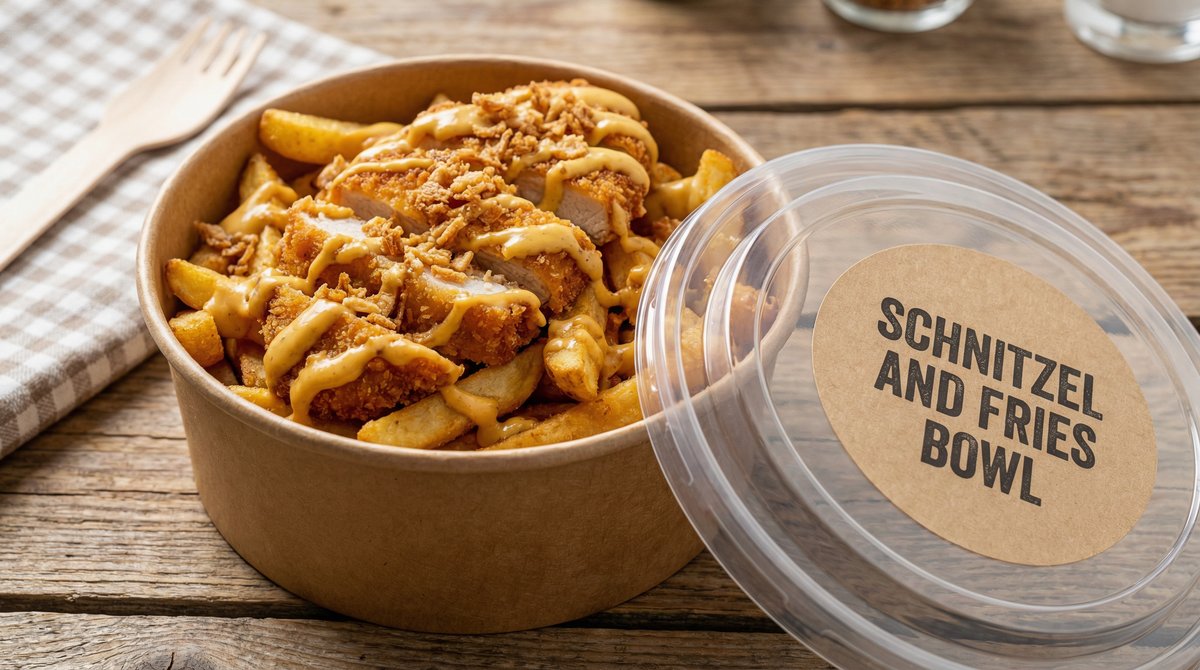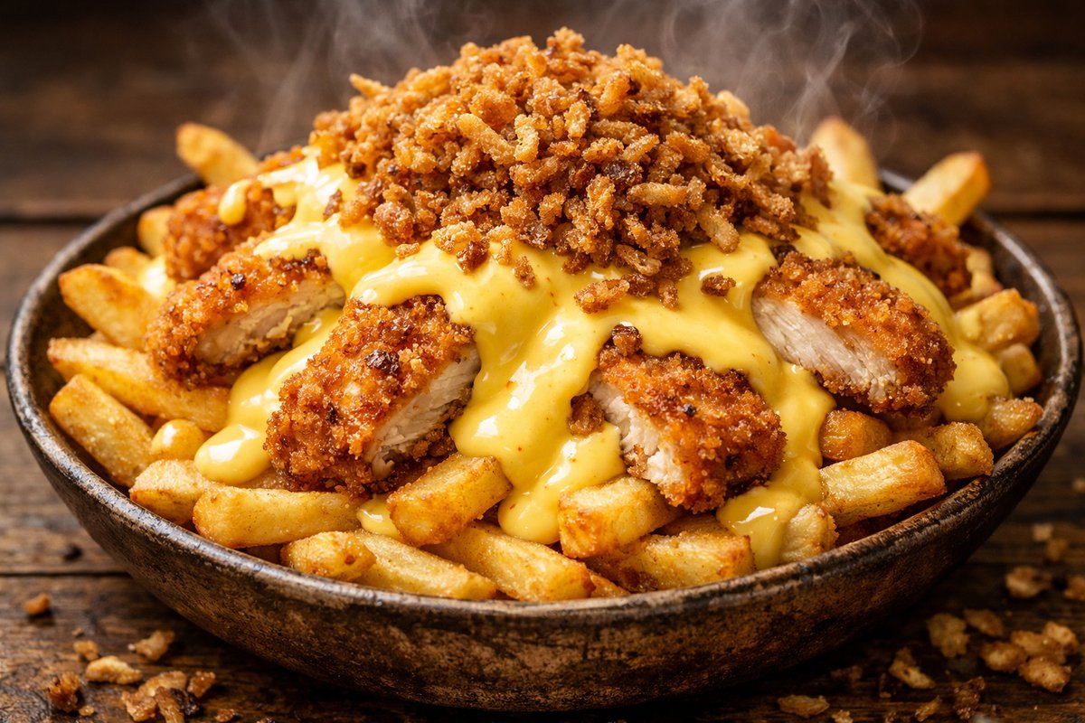 mit knusprigen Home Fries, herzhaftem, knusprigem Hähnchenschnitzel, Spezialsoße und Röstzwiebeln