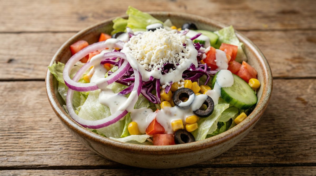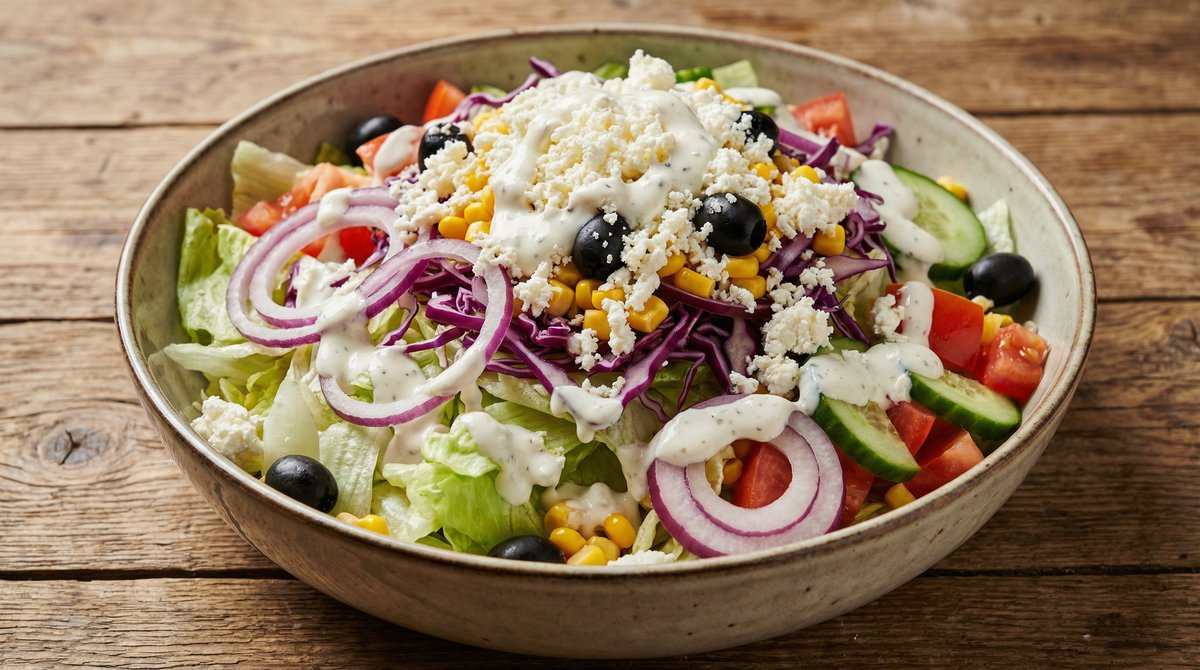 mit Rotkraut, Tomaten, Gurken, roten Zwiebeln, Mais, schwarzen Oliven, Weichkäse, Salatsoße und Granatapfelsirup