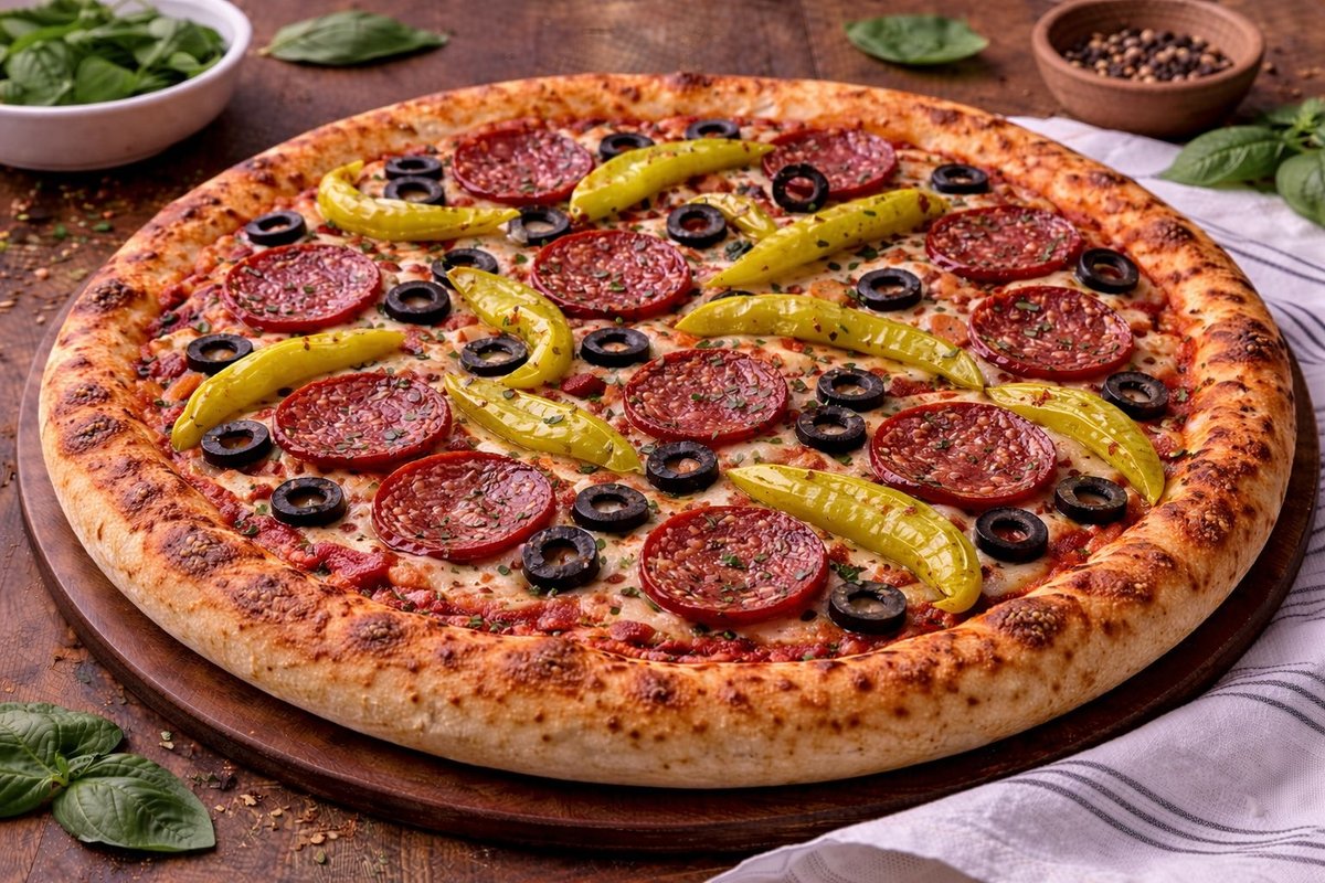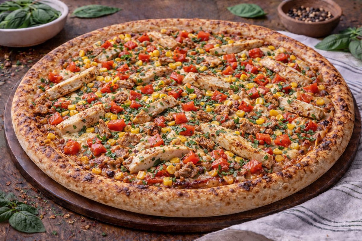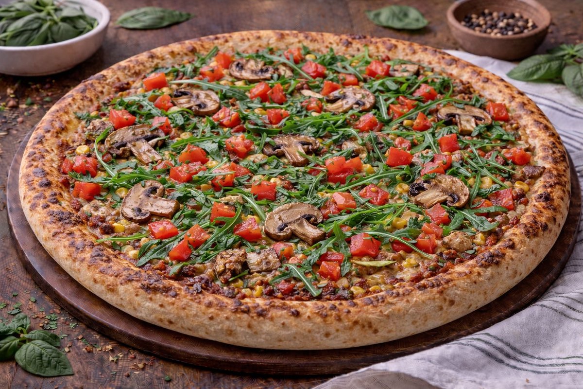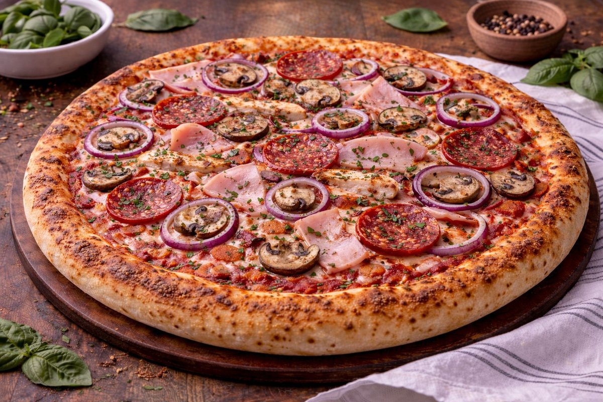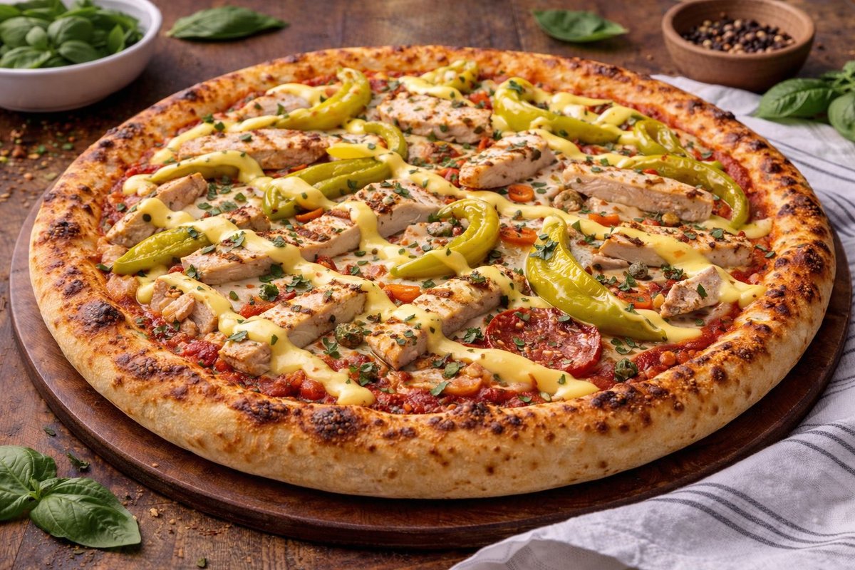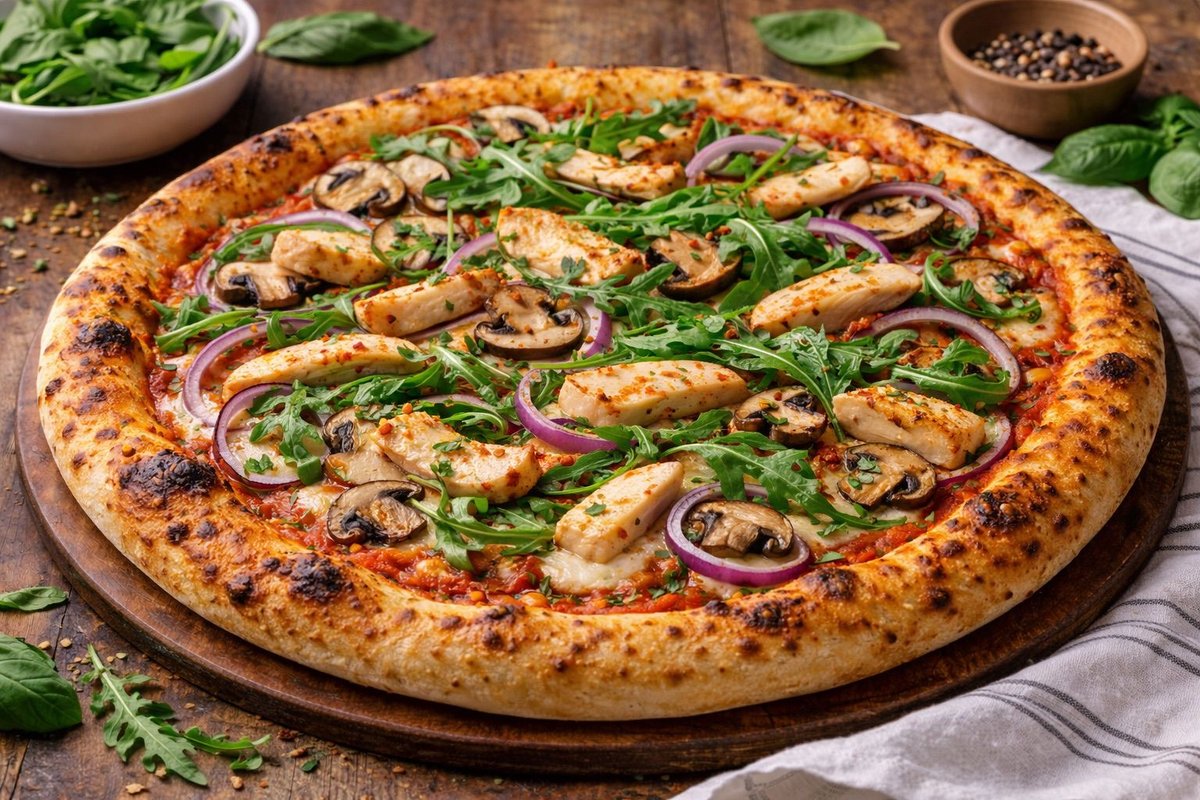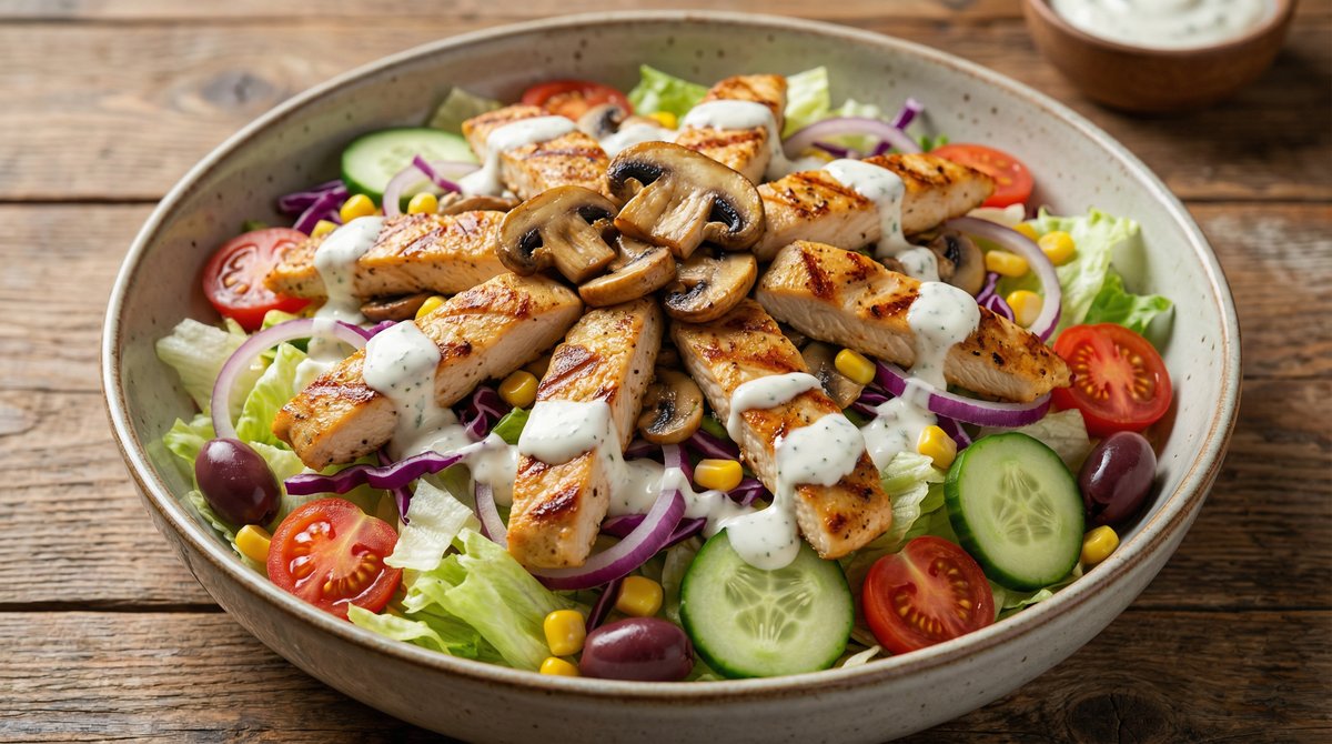 mit Tomaten, schwarzen Oliven, Gurken, roten Zwiebeln, angebratenen frischen Pilzen, Hähnchenbruststreifen und hausgemachter Spezialsoße