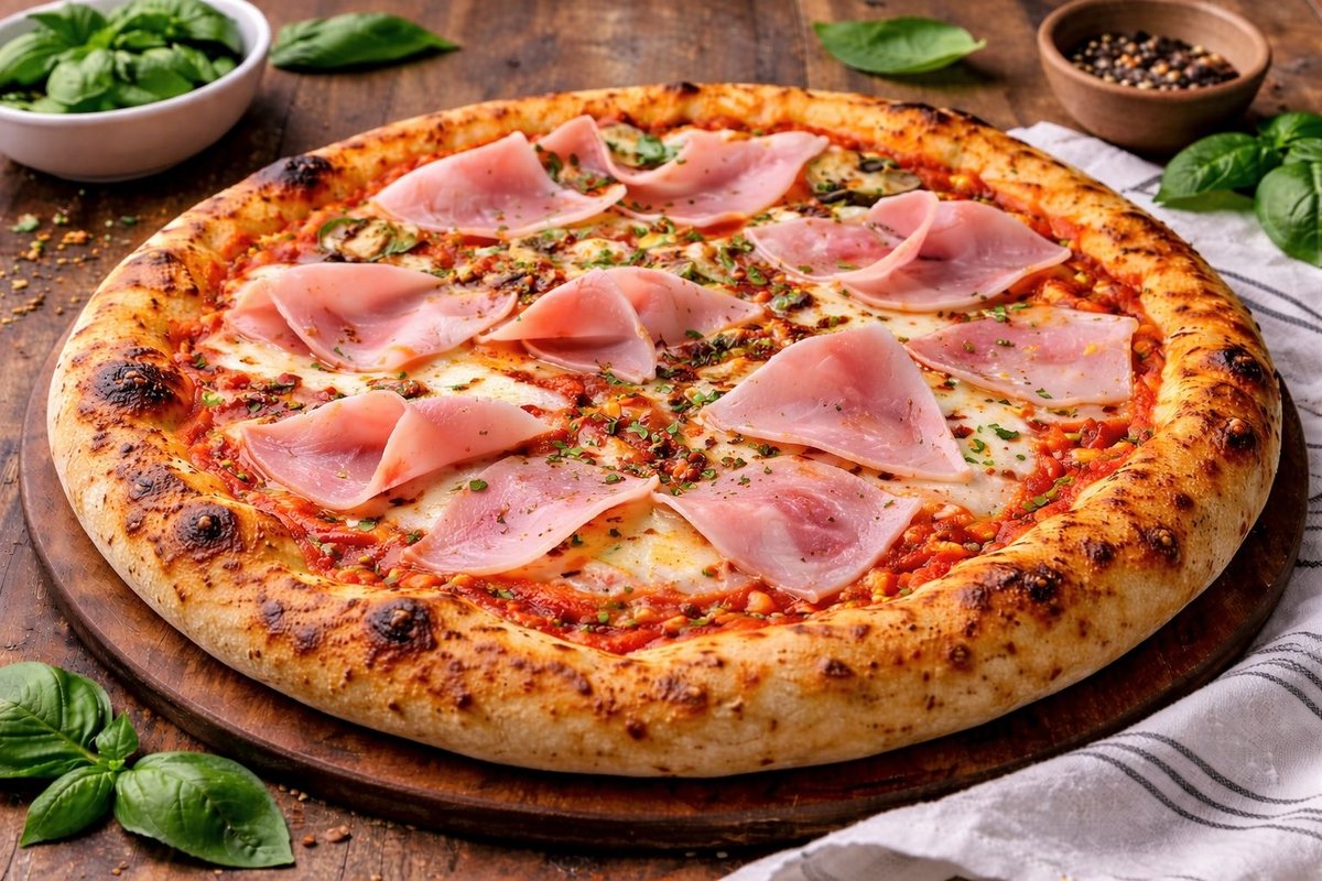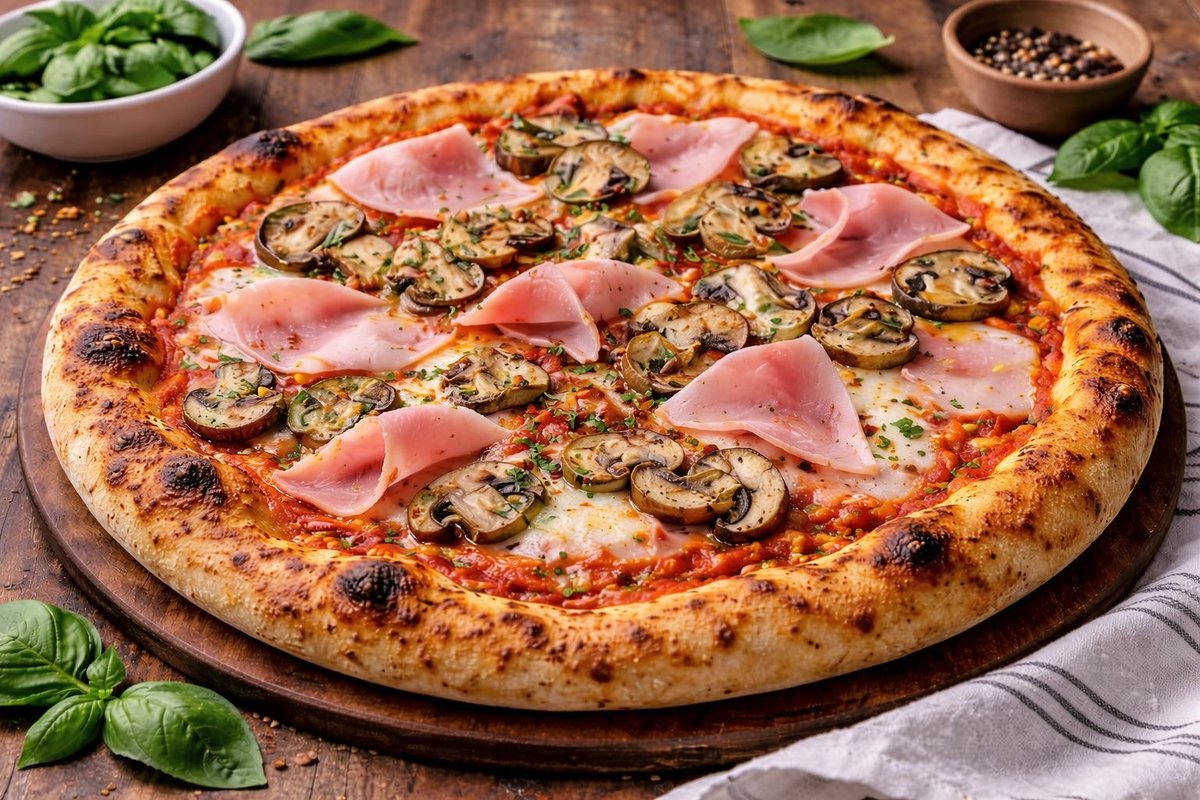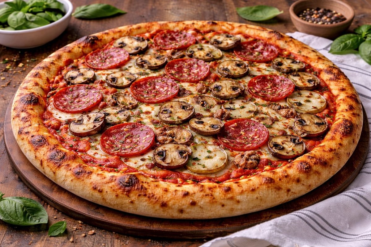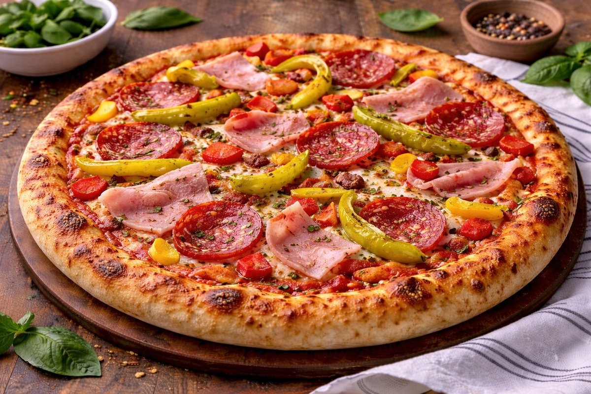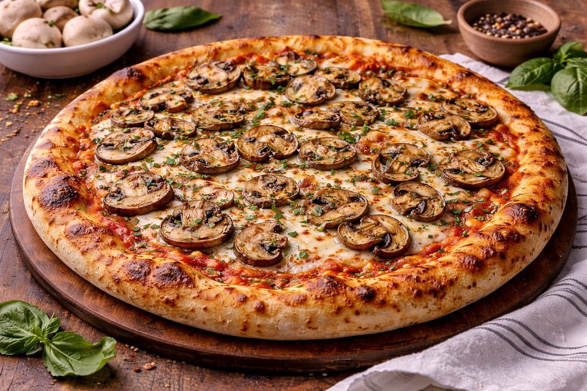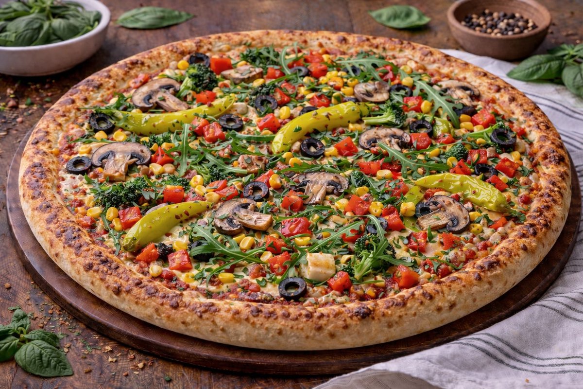 mit Tomaten, schwarzen Oliven, Gurken, roten Zwiebeln, angebratenen frischen Pilzen, Hähnchenbruststreifen und hausgemachter Spezialsoße