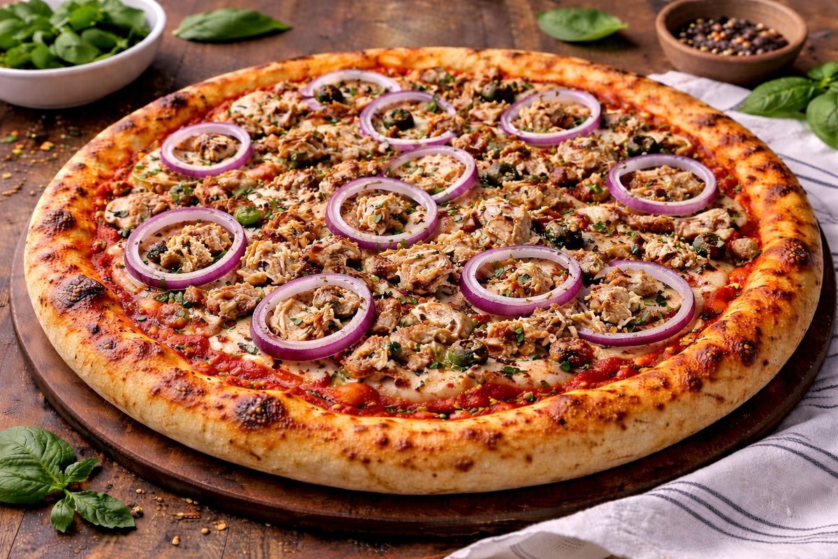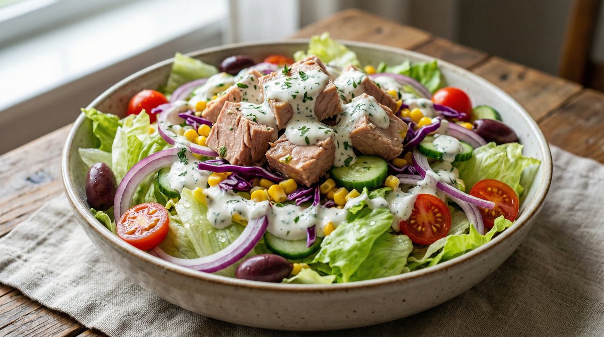 mit Rotkraut, Tomaten, schwarzen Oliven, Gurken, roten Zwiebeln, Thunfisch, Mais, hausgemachter Spezialsoße und Salatsoße