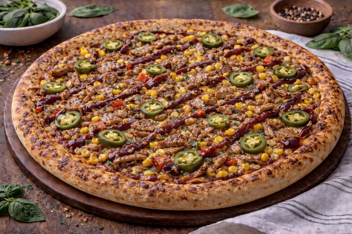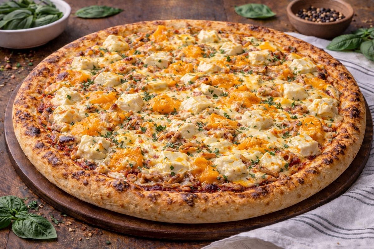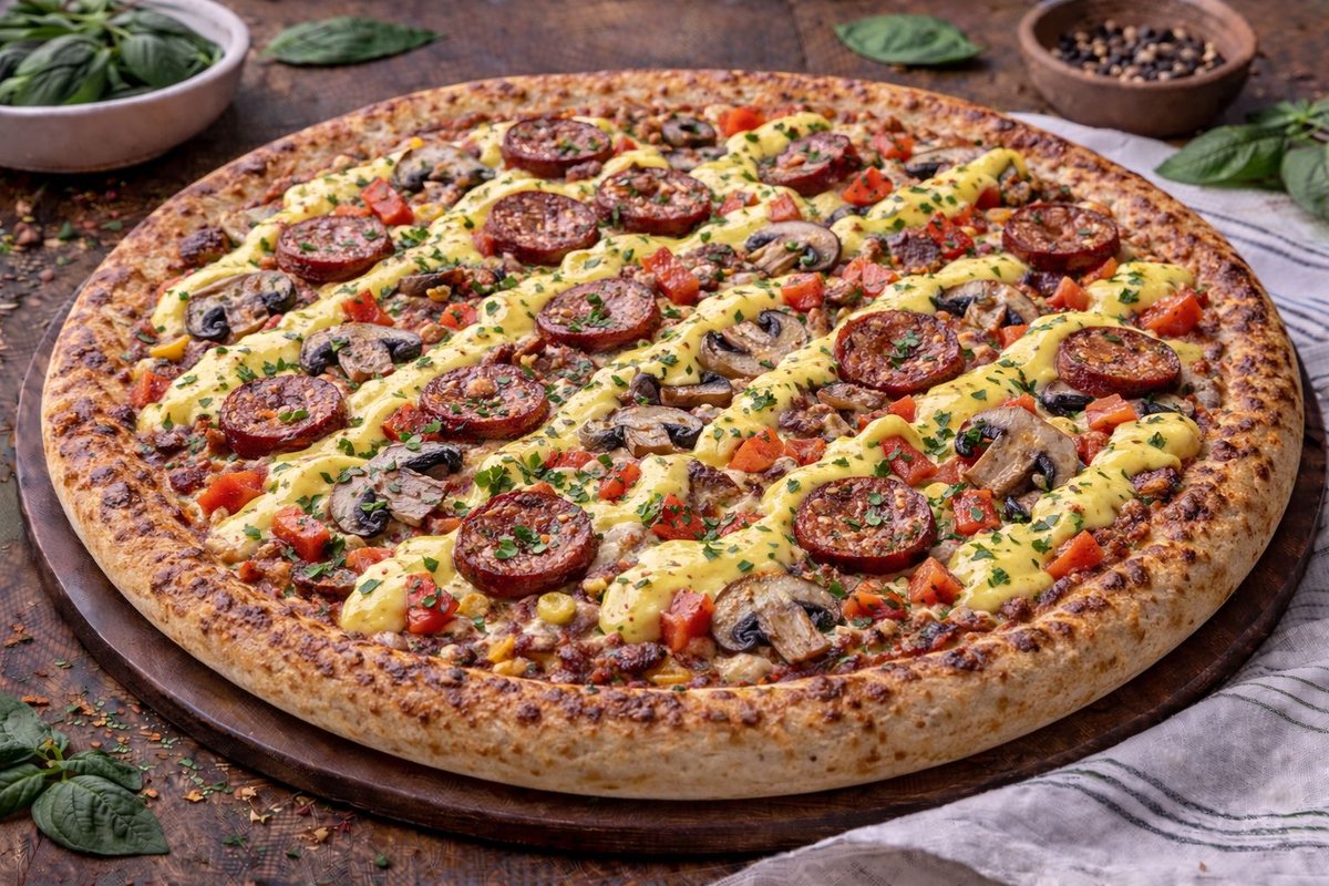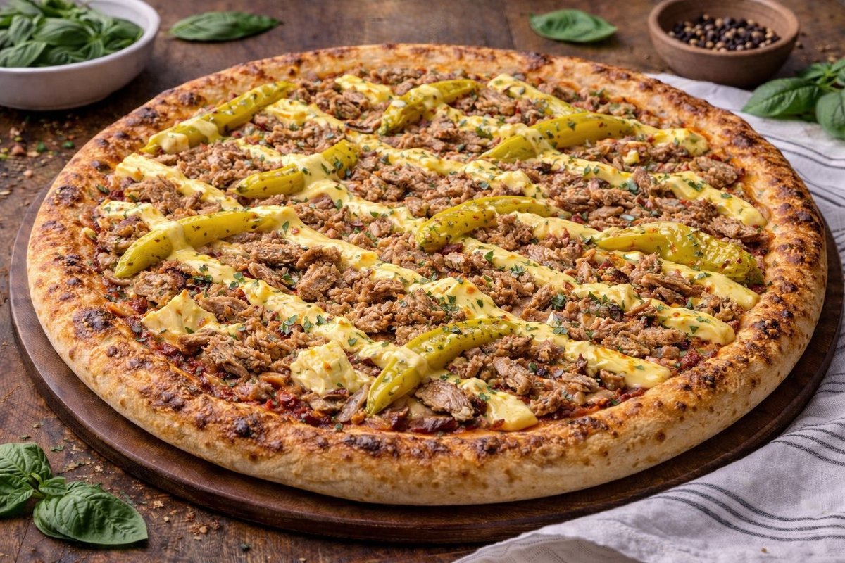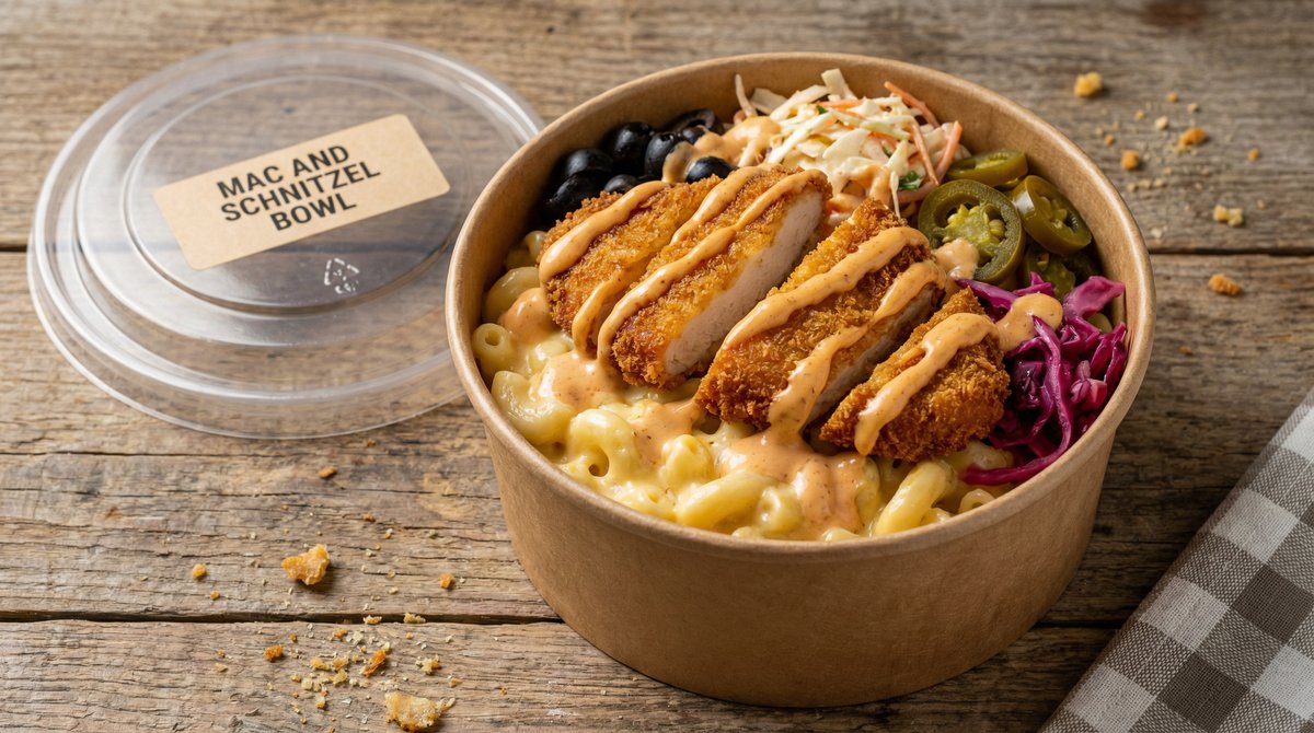 Nudeln mit geschmolzener Käsesoße, herzhaftem, knusprigem Hähnchenschnitzel, schwarzen Oliven, Krautsalat, Jalapeños, eingelegtem Rotkraut und spezieller hausgemachter Soße