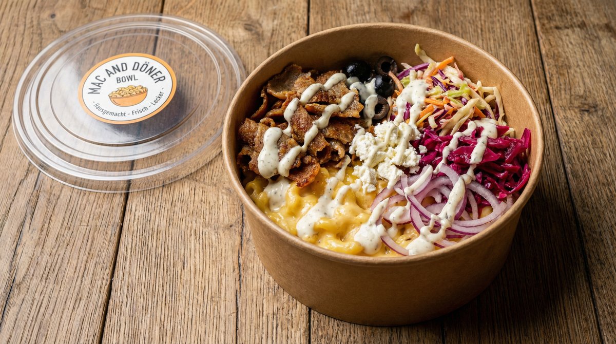 Nudeln mit geschmolzener Käsesoße, knusprigem Drehspießfleisch vom Hähnchen, Krautsalat, schwarzen Oliven, eingelegtem Rotkraut, roten Zwiebeln, Weichkäse und Knoblauchsoße