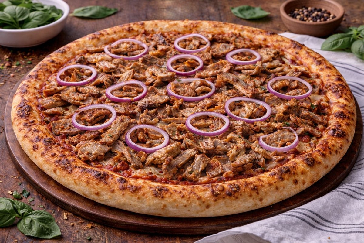 mit Drehspießfleisch vom Hähnchen und Zwiebeln