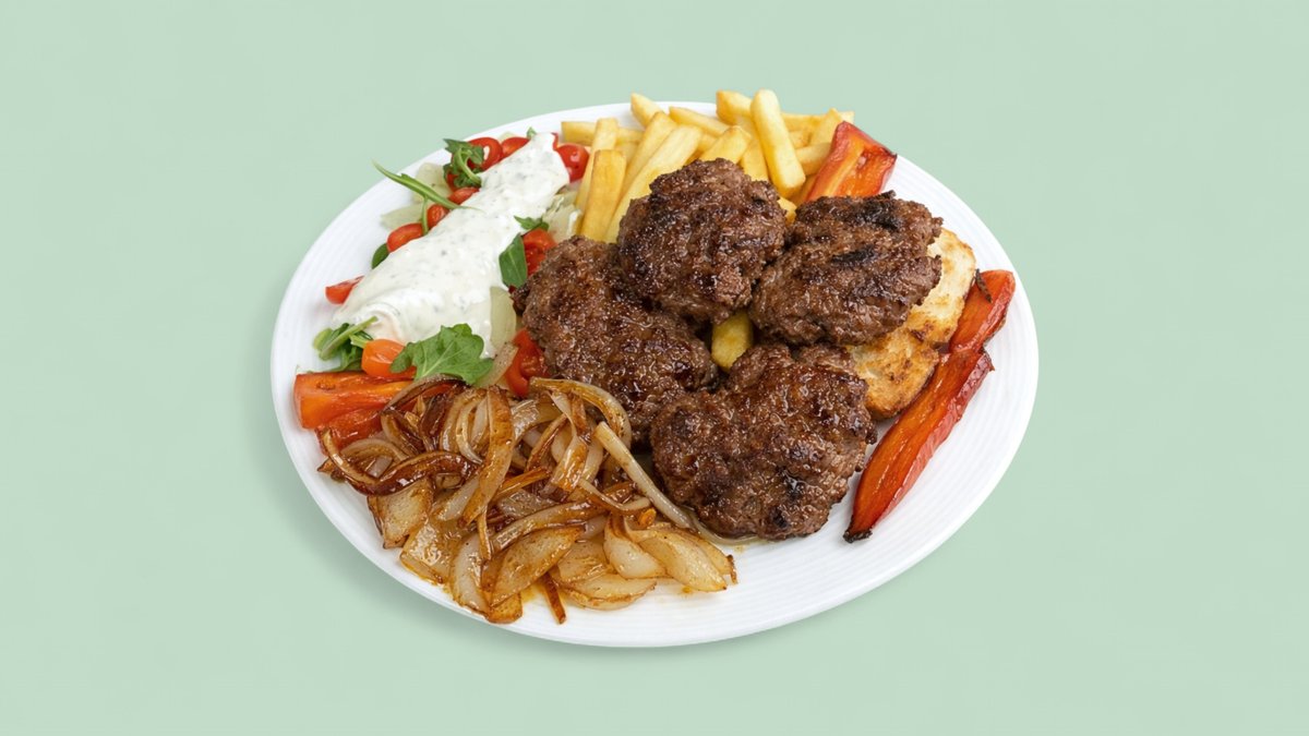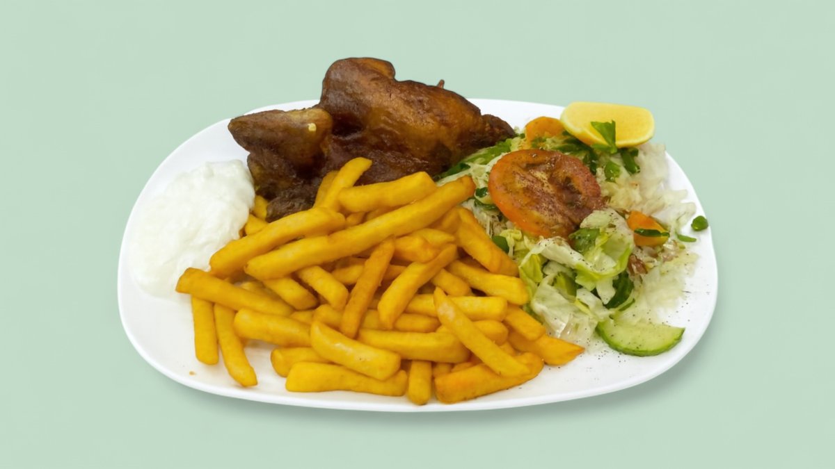 mit Pommes frites, Tsatsiki und einer Fleischsorte deiner Wahl