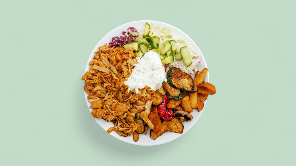 mit Drehspießfleisch deiner Wahl, Salat, Kartoffelecken und Tsatsiki
