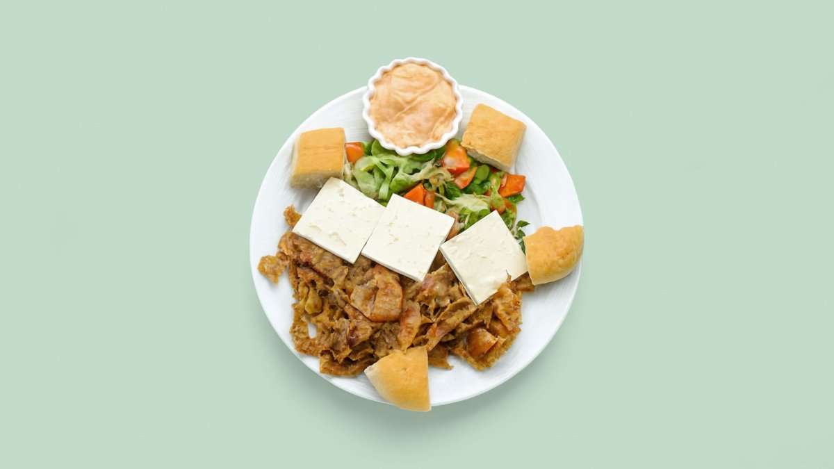 mit Drehspießfleisch deiner Wahl, Brot, Salat, Weichkäse und Tsatsiki