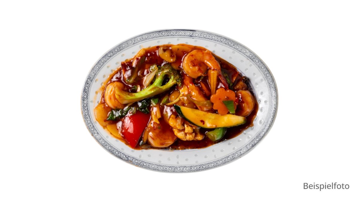 alle Gerichte werden mit Rosmarinkartoffeln und einem kleinen Salat serviert („56. Garnelen-Pfanne” wird ohne Rosmarinkartoffeln serviert)