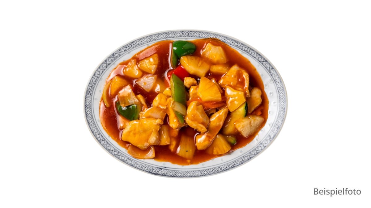 mit Schwein, Reis, einem kleinen Salat und Metaxasoße Enthält Alkohol, für Kinder und schwangere Frauen nicht geeignet