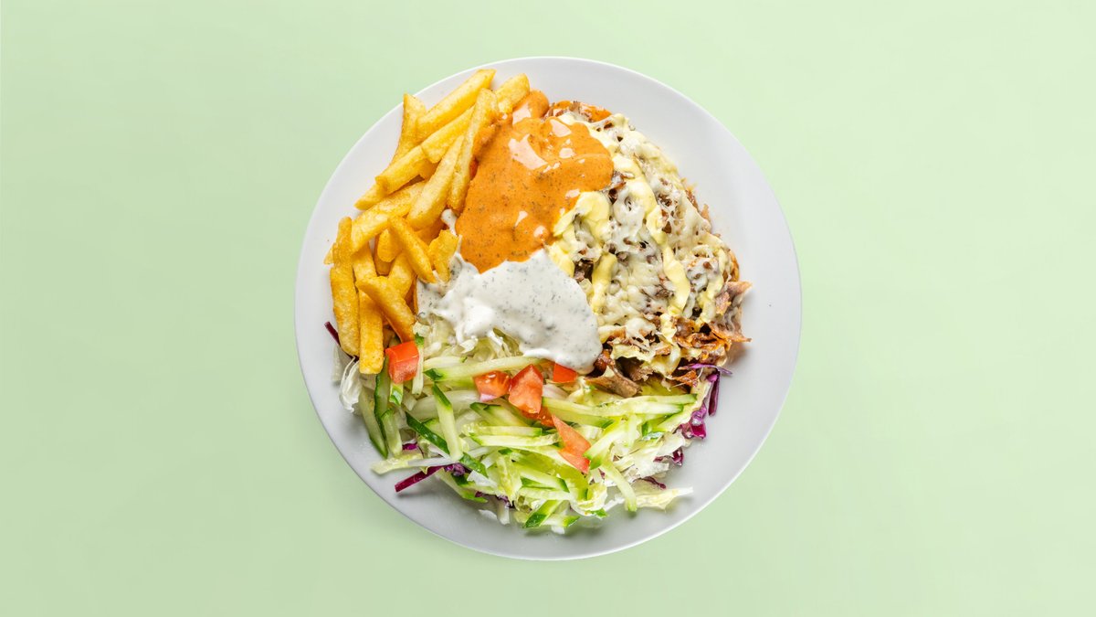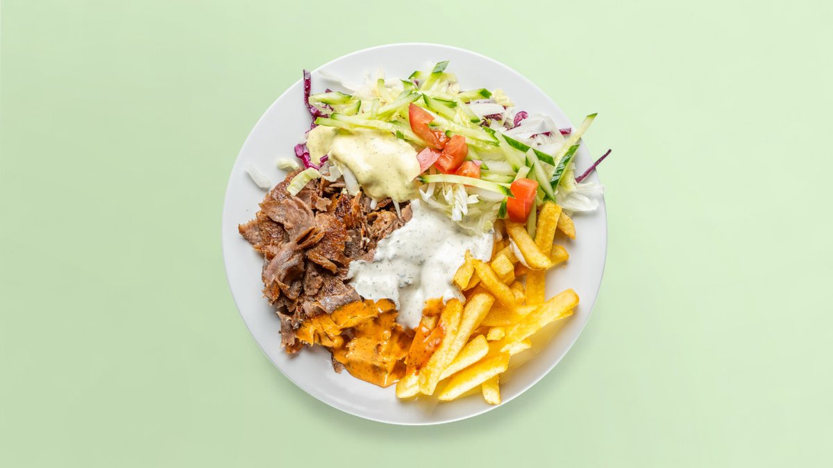 alle Gerichte werden mit Eisbergsalat, Weißkraut, Rotkraut, Tomaten, Gurken, Zwiebeln und einer Fleischsorte deiiner Wahl zubereitet („Döner Box” wird ohne Salat zubereitet und „Falafel Döner” und „Vegetarischer Döner” werden ohne Fleisch zubereitet)