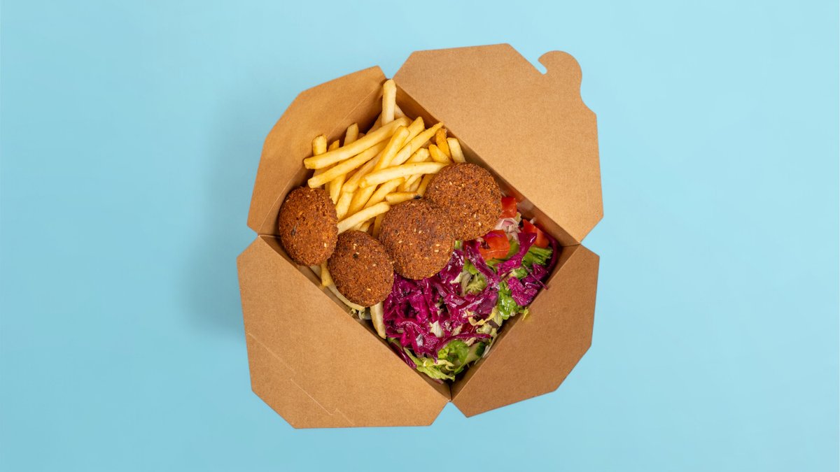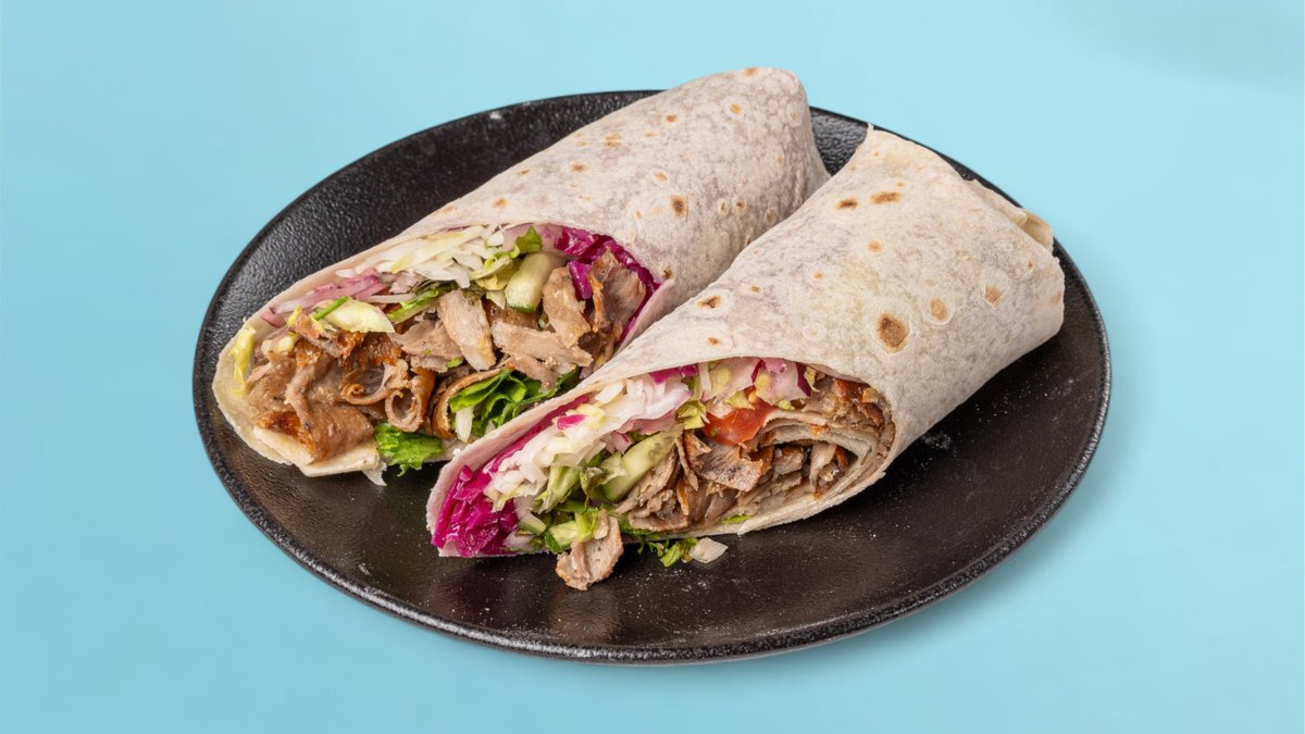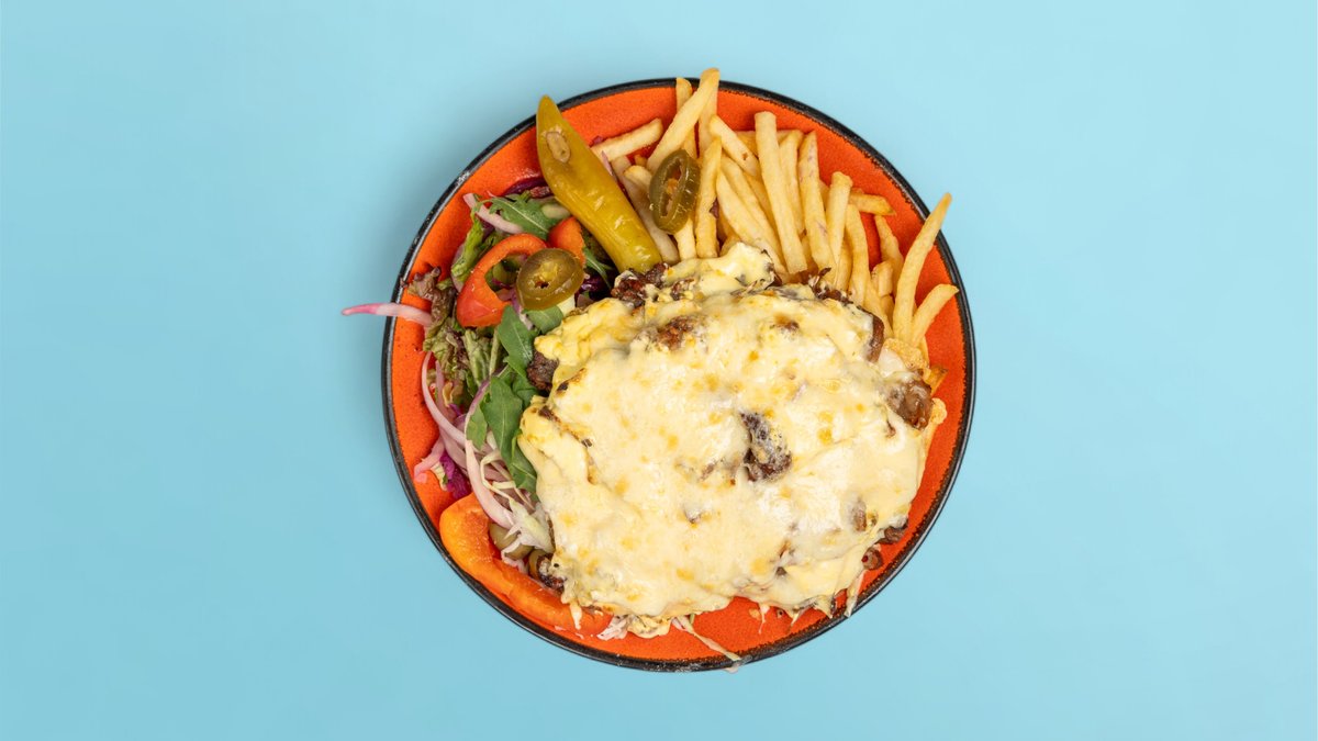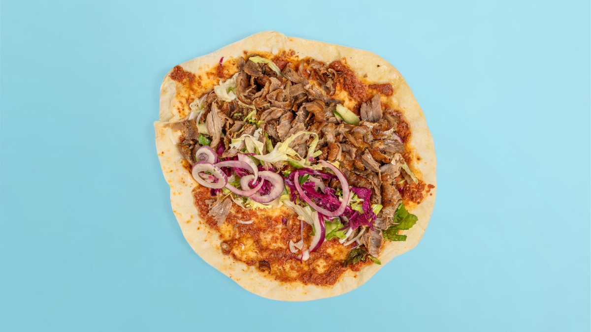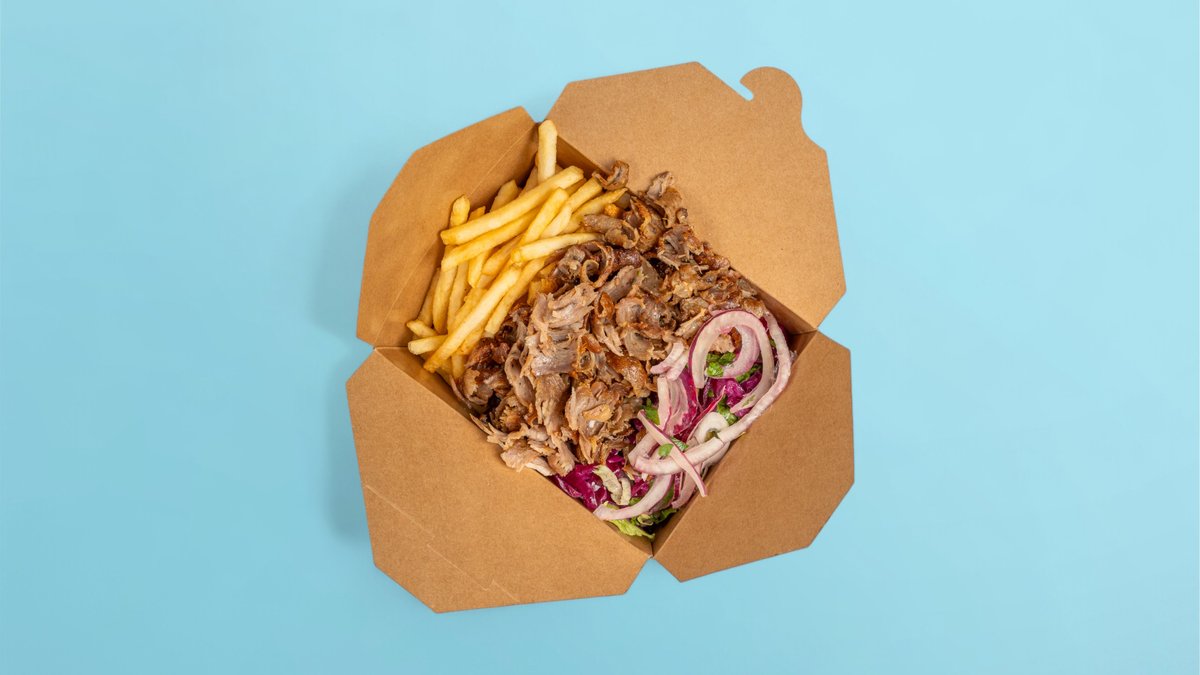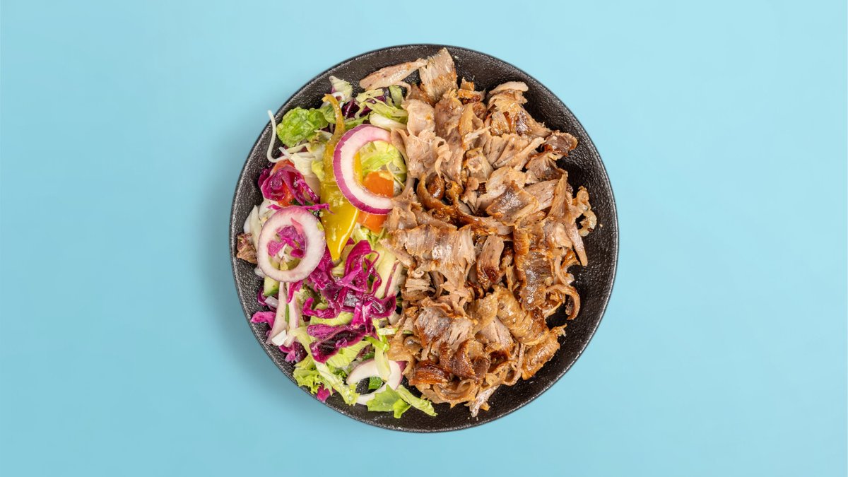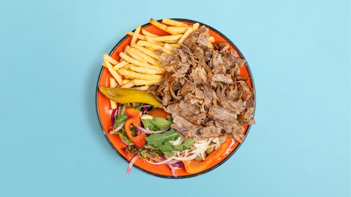 mit Salat, Weißkohl, Rotkohl, Zwiebeln, Eisbergsalat, Tomaten, Gurken, Pommes frites und einer Fleischsorte deiner Wahl