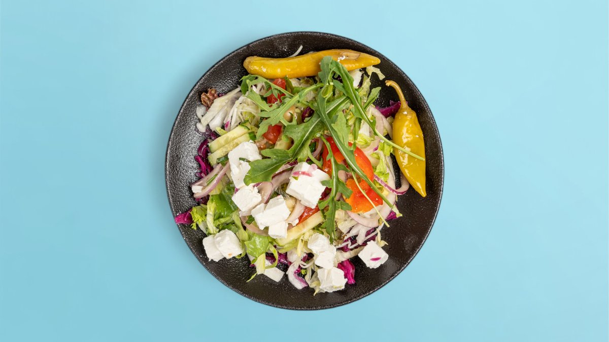 alle Salate werden mit Eisbergsalat, Tomaten, Gurken, Zwiebeln, Rot- und Weißkohl, Karotten, Paprika, Mais, Rucola und einem Dressing deiner Wahl zubereitet