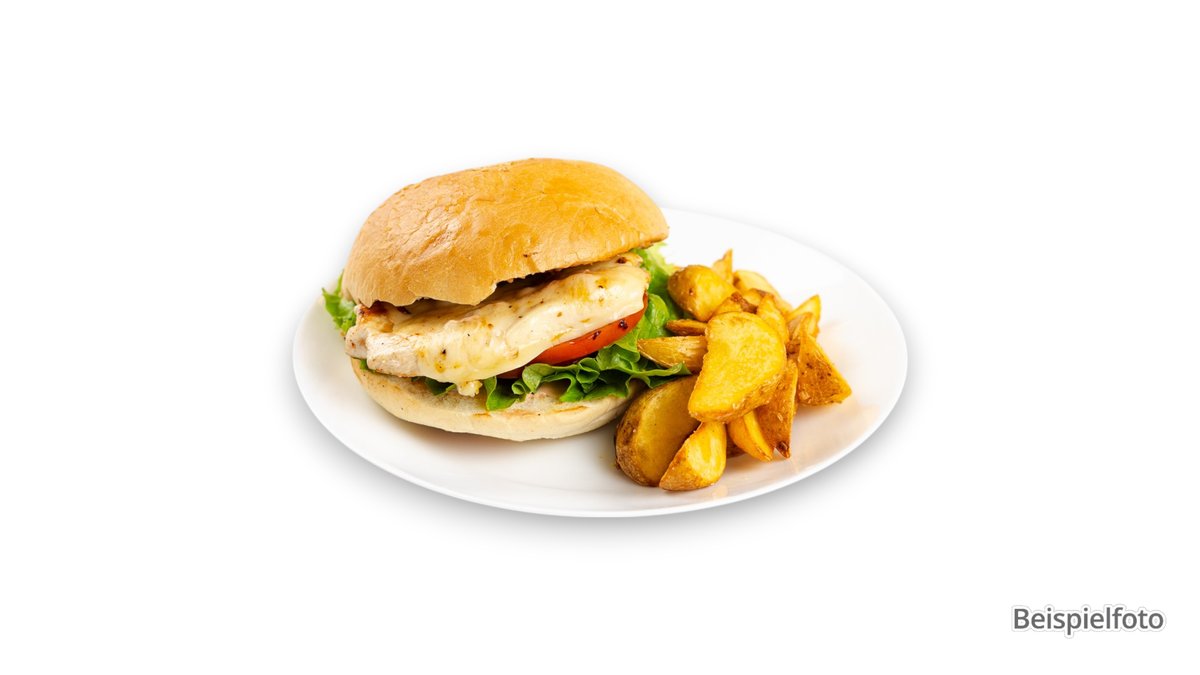 alle Burger werden mit Salat, Tomaten und Käse zubereitet und mit Pommes frites serviert