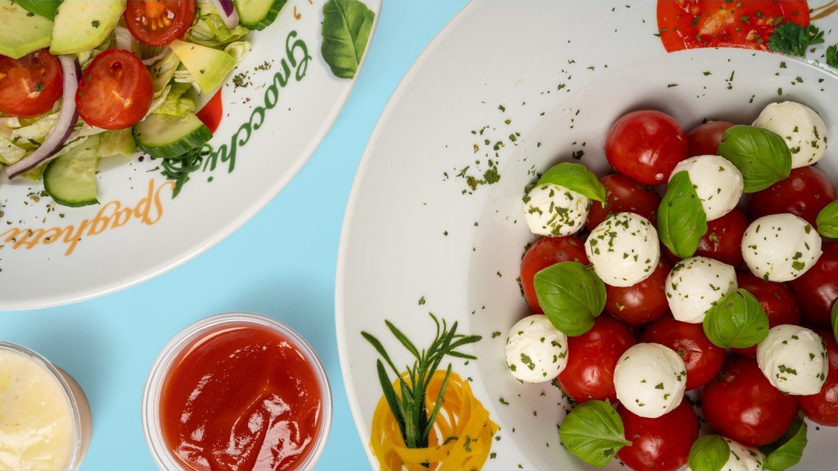 mit Eisbergsalat, Kirschtomaten, Gurken, Käse, Feta, Mozzarella und Ei