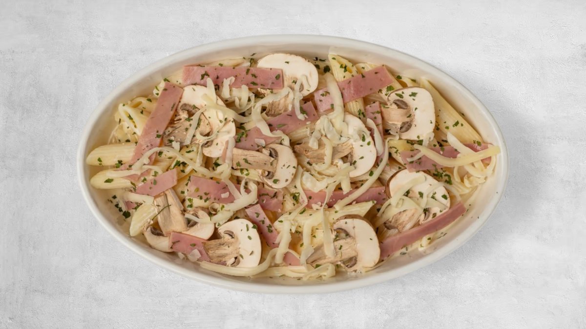 mit einer Pastasorte deiner Wahl, Käse-Sahnesoße und frischen Champignons