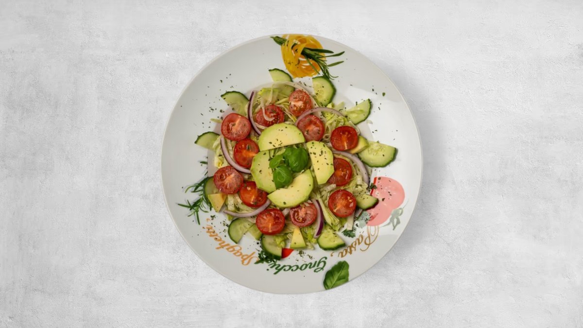 mit frischer Avocado, Eisbergsalat, Tomaten, Gurken, Zwiebeln, Weißkraut und Rotkraut, serviert in einer Größe deiner Wahl