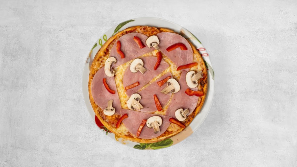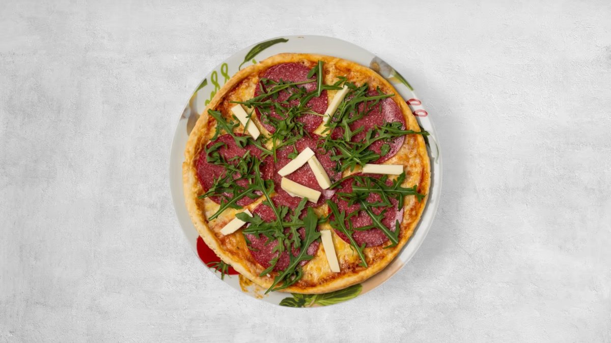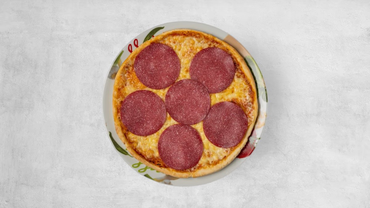 mit Tomatensoße, Schinken und Salami vom Rind und Peperoni