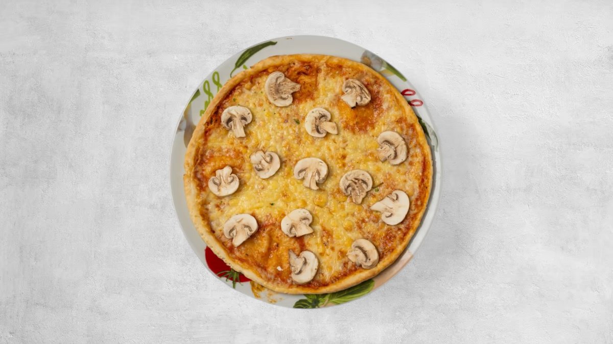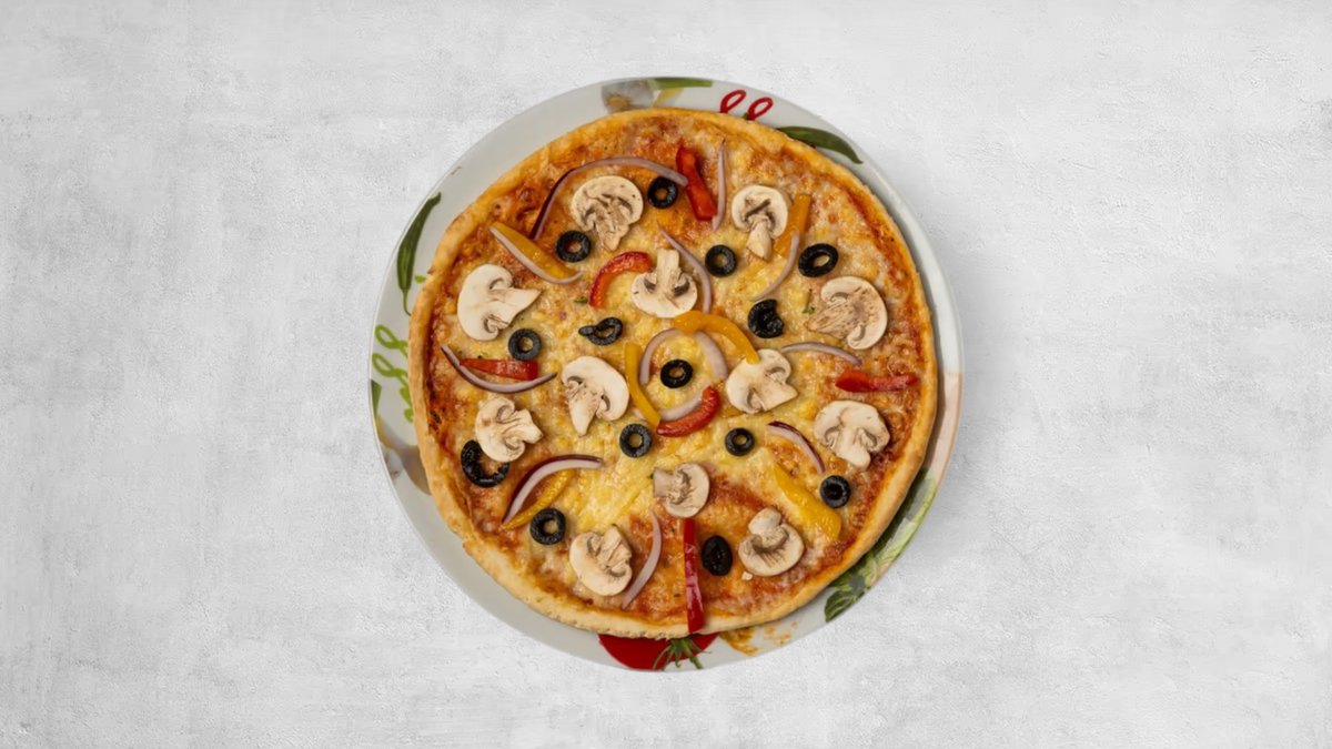 mit Pilzen, Paprika, roten Zwiebeln, Oliven und Käse, serviert in einer Größe deiner Wahl