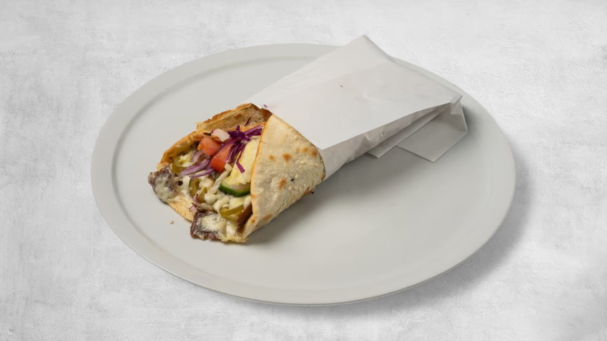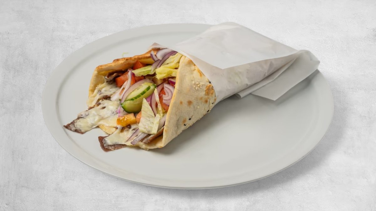 mit gegrilltem Kalb- und Rinderhackfleisch, Joghurt, Tomatensoße, Kraut, Zwiebeln und Tsatsiki