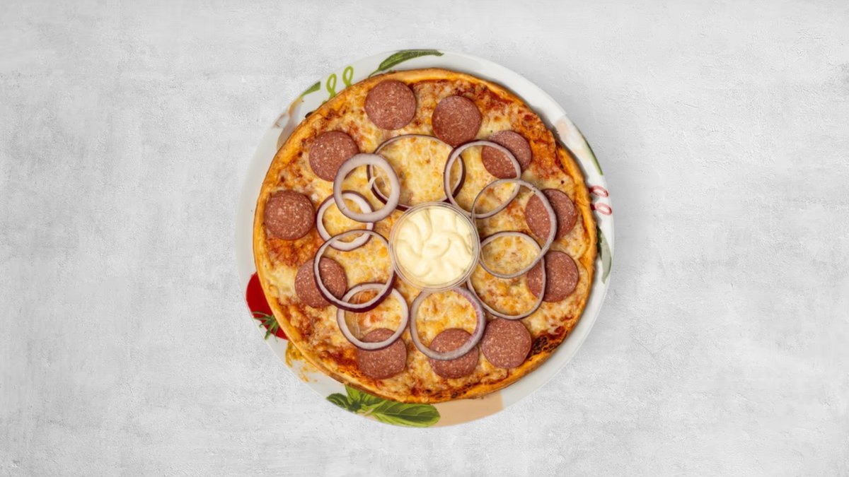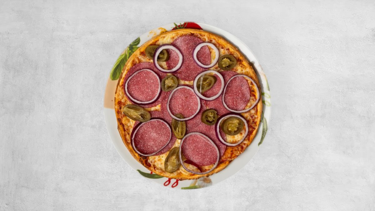 mit Salami vom Rind, Jalapeños und roten Zwiebeln