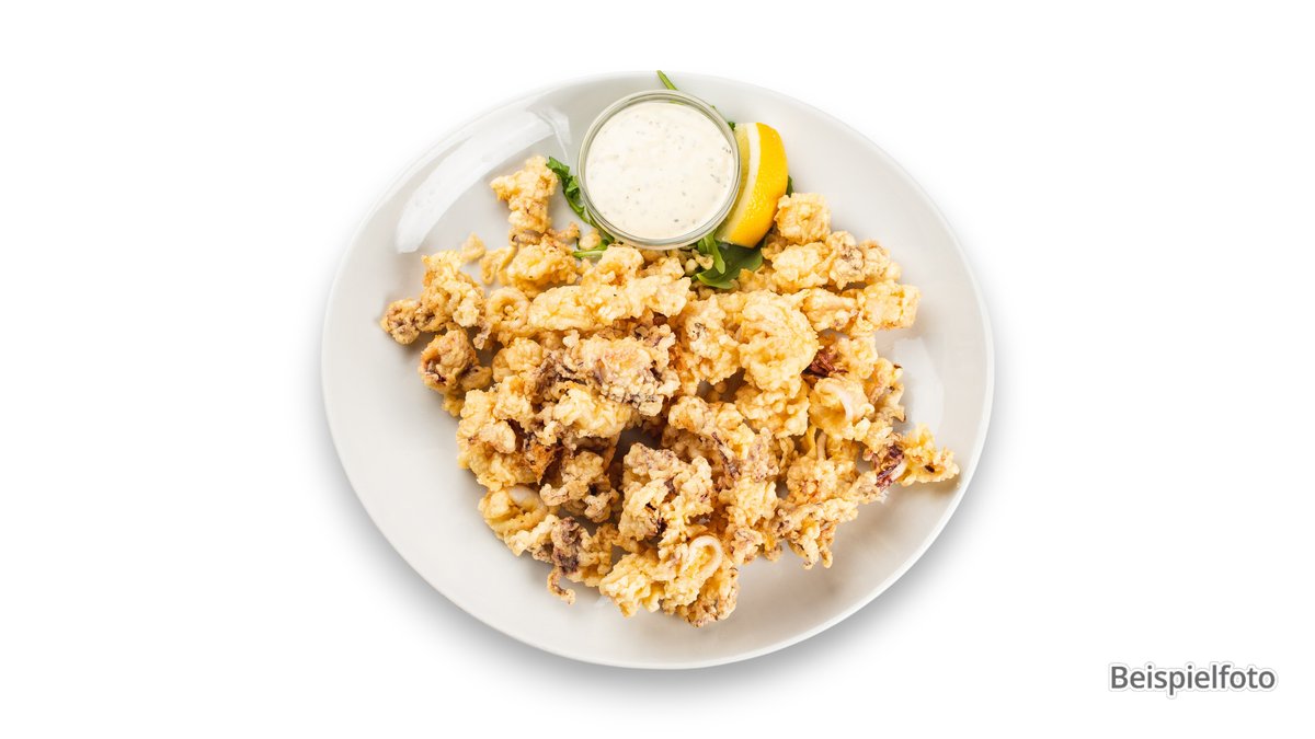 panierte und frittierte Aubergine mit Knoblauch, dazu Tsatsiki