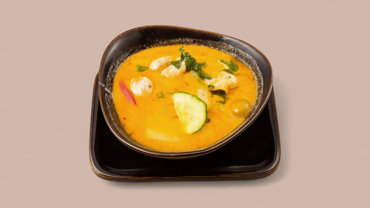 mit Huhn, Champignons, Tomaten, Zwiebeln, Kokosmilch, verfeinert mit Limettenblättern und Koriander
