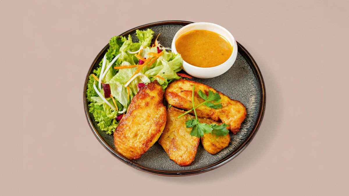 gegrilltes Hähnchenbrustfilet mit gemischtem Salat und Saté-Soße, dazu Reis
