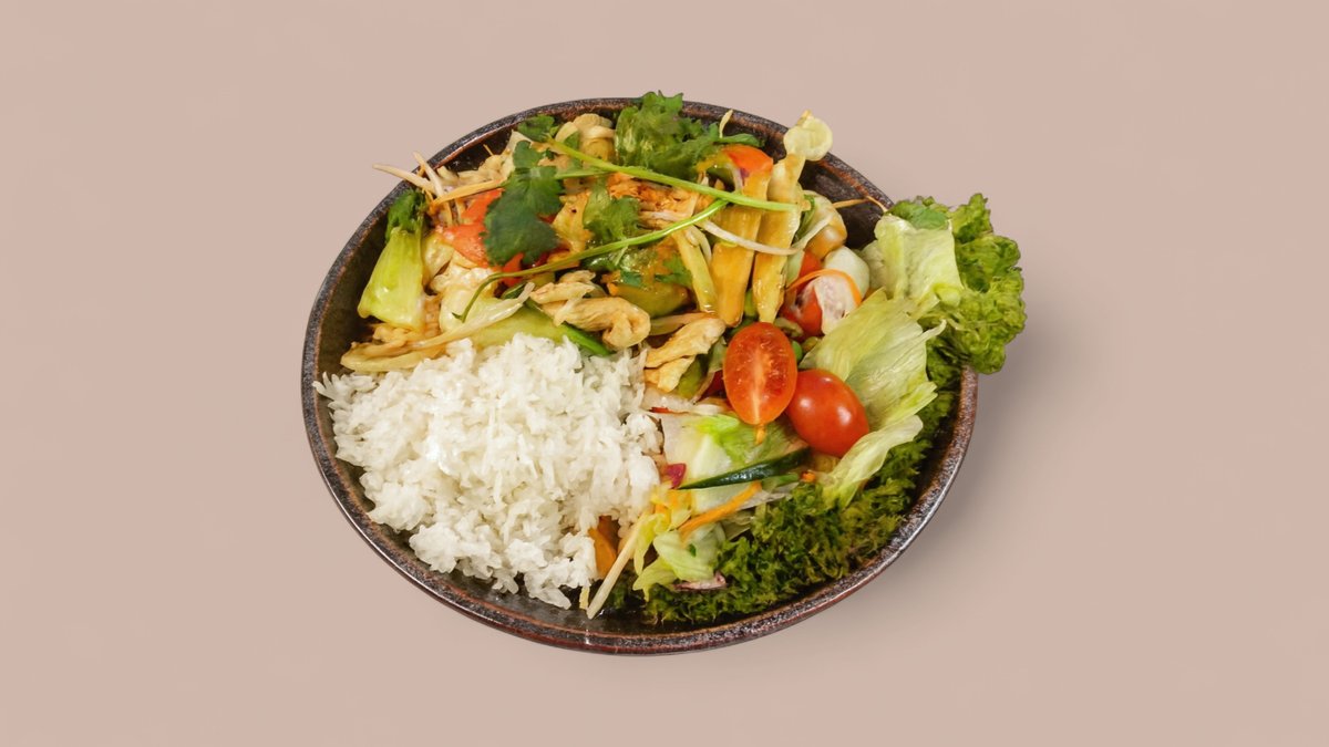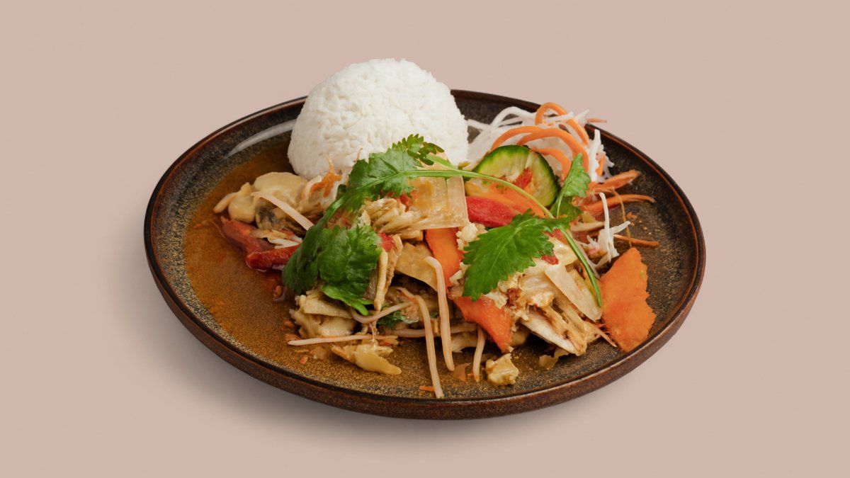 leicht scharf buntes Wokgemüse in leicht scharfer Thai-Curry-Kokos Soße, serviert mit luftigem Duftreis und einer Zutat nach Wahl