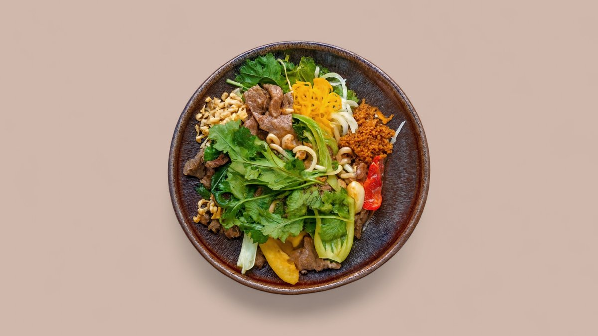 angebratene Udon-Nudeln mit zartem Rindfleisch, buntem Wok-Gemüse, Zitronengras, Chili und Koriander, garniert mit frischen Kräutern