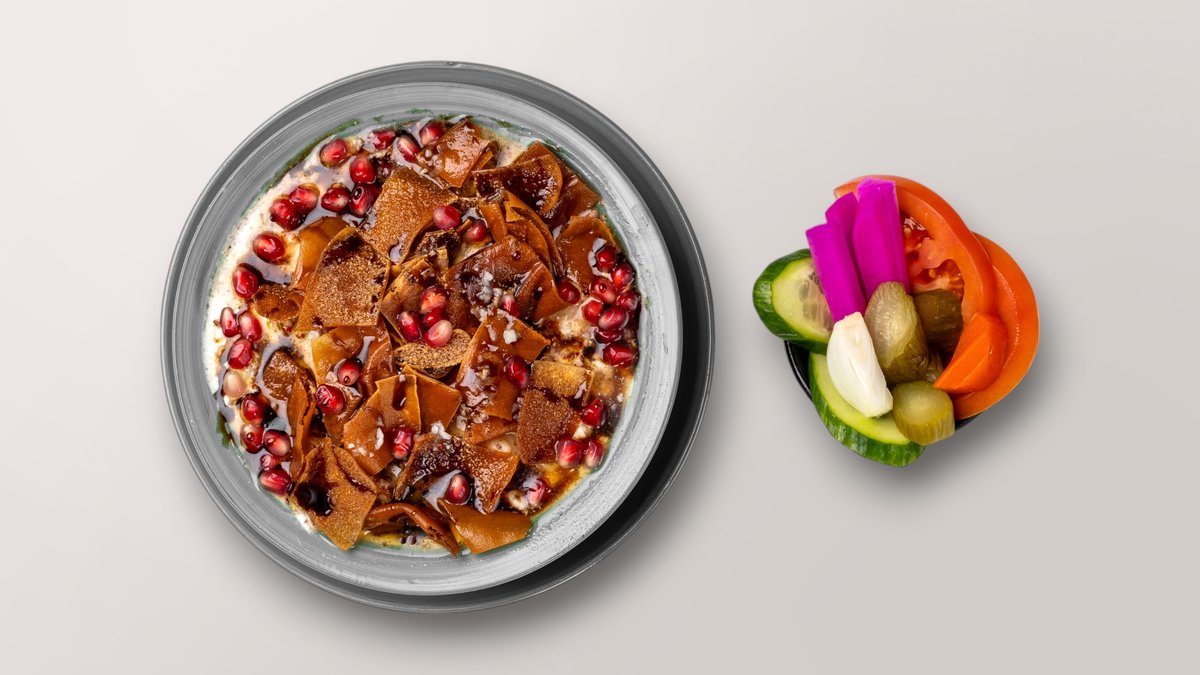 gekochte Kichererbsen mit frittierten Brotscheiben in Tahini mit Knoblauch, Zitronensaft und Margarine