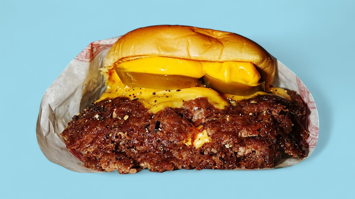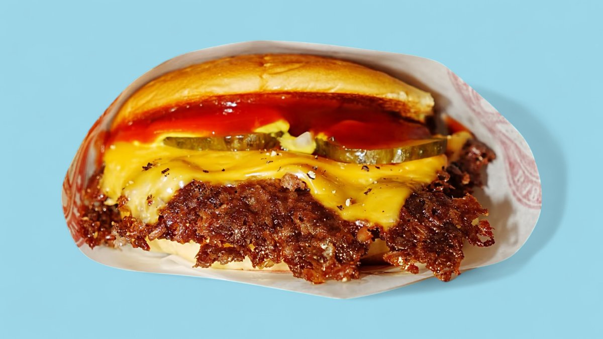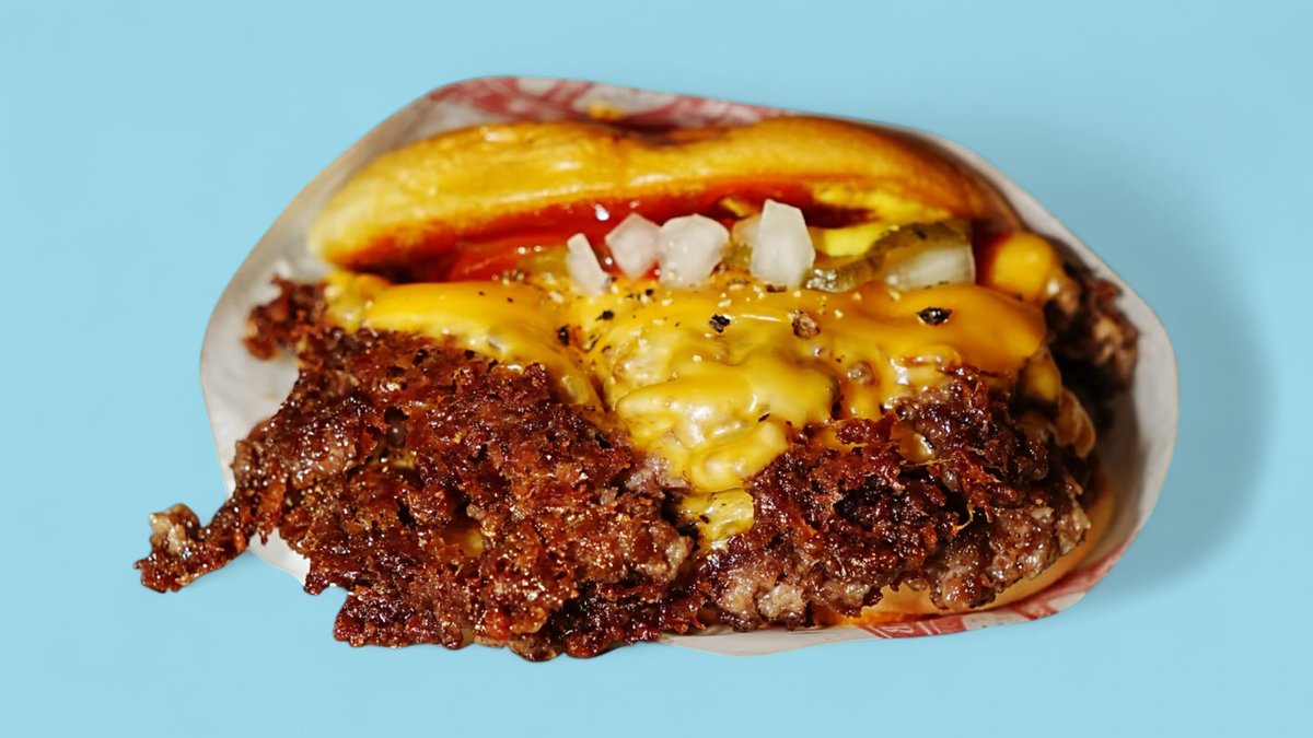 mit doppeltem 100 g Rindfleischpatty, doppeltem Käse, Gewürzgurken, Zwiebeln, Ketchup und Senf