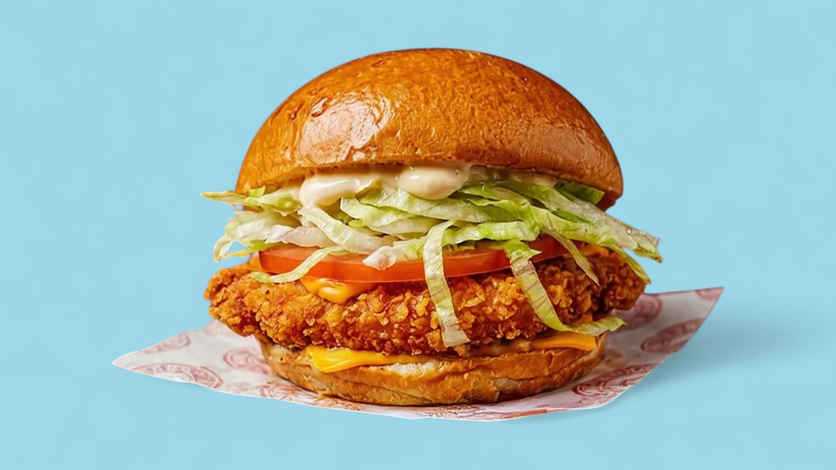 mit Crispy Chicken, Käse, Salat, Tomaten, Zwiebeln und Mayonnaise