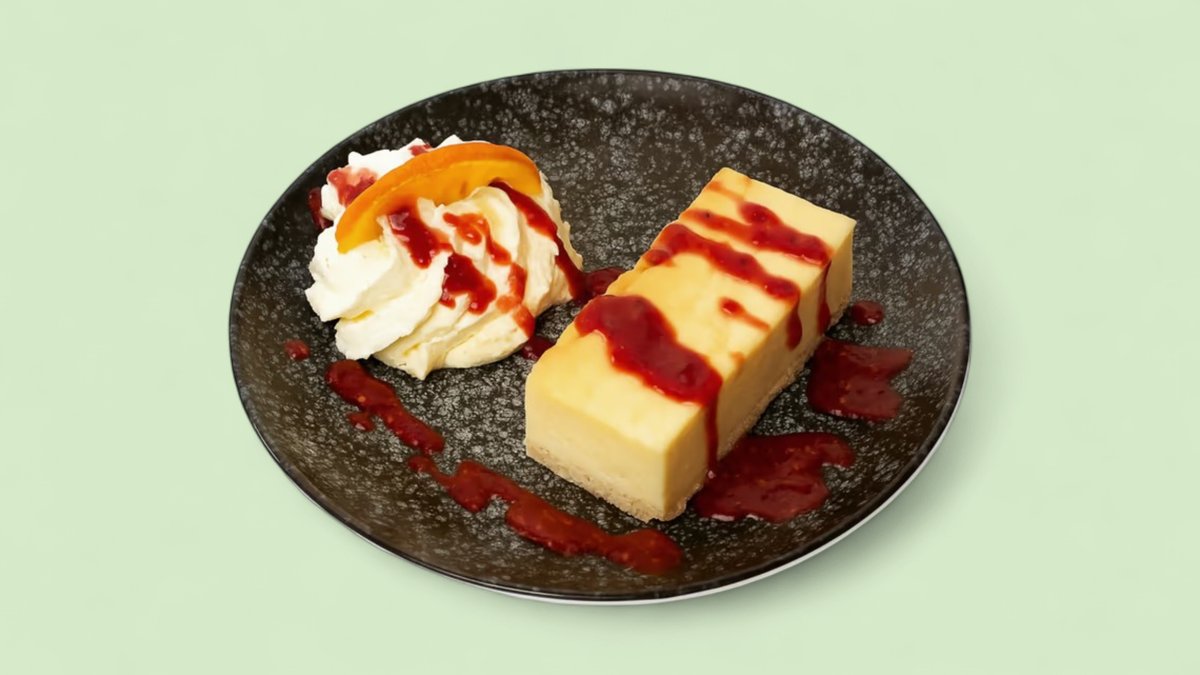 Käsekuchen mit hausgemachter Himbeersoße und Sahne